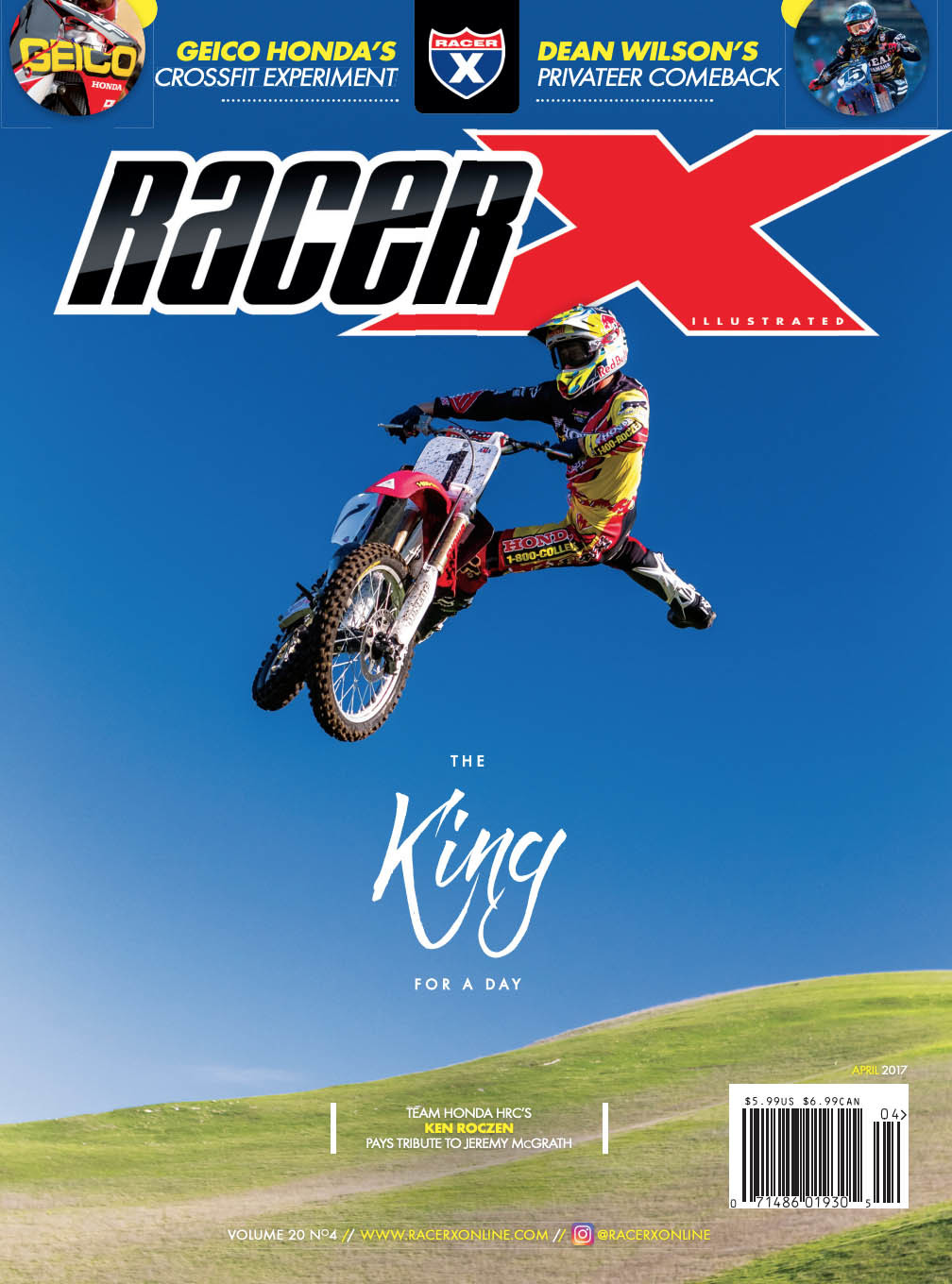 McGrath was again the subject of our cover in April 2017, but he was not actually riding. Instead it was Ken Roczen doing a spot-on remake of Jeremy's epic scenes from Fox Racing's TerraFirma 2 free riding video, aboard a 1996 Honda CR250! Roczen and Red Bull filmed the scene at the exact same place where McGrath originally rode, Castillo Ranch in central California. Here's the video in case you missed it: