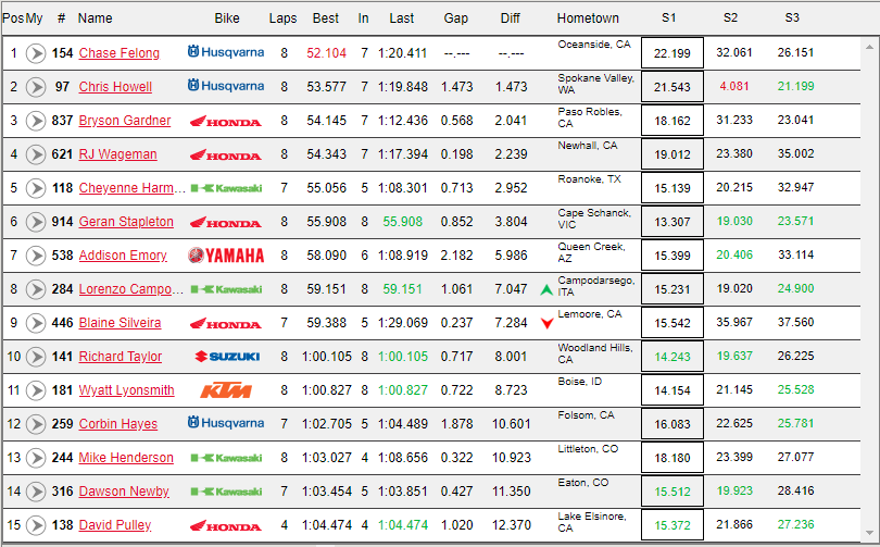 | 3 | Chris Howell | +02.245 | 48.294 | Spokane, WA | Husqvarna FC 250 | |