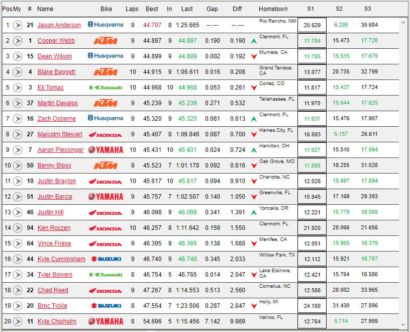 | 5 | Zach Osborne | +04.699 | 44.860 | Abingdon, VA | Husqvarna FC 450 |