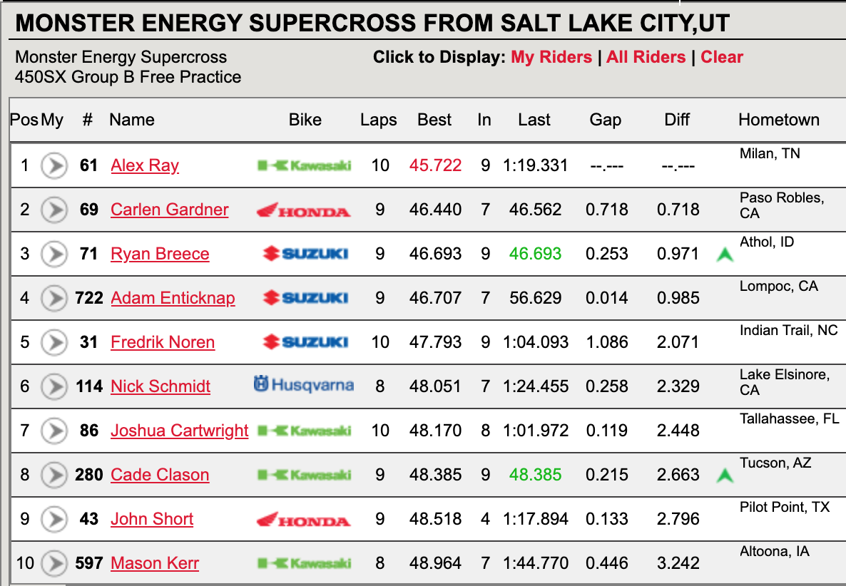 | 1 | Alex Ray | 45.792 | Jackson, TN | Kawasaki KX450 | ||
