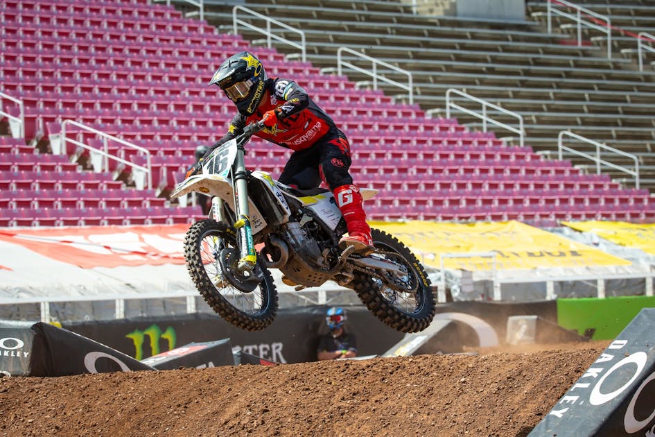 Steve Matthes: Okay, 450 class from Salt Lake, Zach Osborne takes the win. [Jason] Anderson is under fire, Osborne drops back a bit, he loses a side panel, then Anderson loses a seat, and then seat triumphs over side panel, and Zach gets around him to take the win. Do you care, JT, that Osborne gets the win but only because Anderson’s seat fell off?