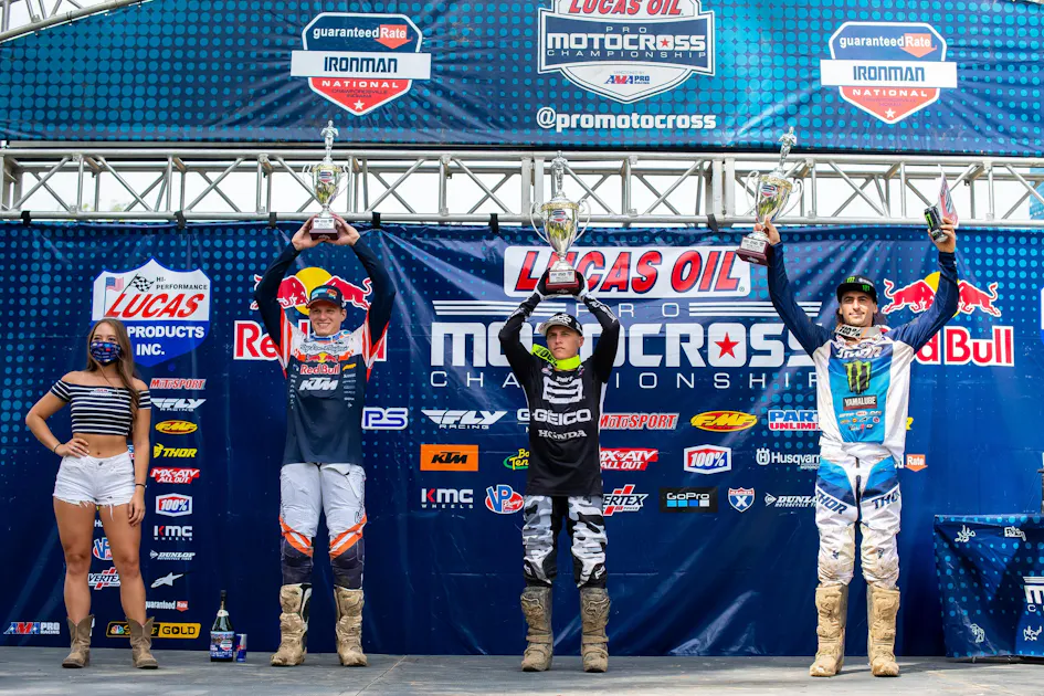 At the 2020 Ironman National, GEICO Honda’s Jeremy Martin finished 2-1 took his second overall win of the Lucas Oil AMA Pro Motocross Championship. Monster Energy/Star Racing Yamaha’s Dylan Ferrandis won the first moto but collided with several riders in the first turn of the second moto and was in 40th place as he rounded the second turn. Somehow, Ferrandis managed to charge all the way back inside the top five before taking third from Troy Lee Designs/Red Bull KTM’s Brandon Hartranft. Ferrandis’ 1-3 was bested by Martin’s 2-1. Hartranft finished a steady 3-4 to earn his first overall podium finish as he rounded out the podium.