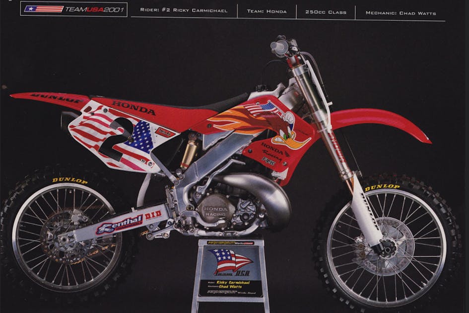 Eight days later, 9/11 happened and everything changed. With the country stunned by the need to make sense out of the horror that had just happened, all commercial flights and private air travel were literally grounded by the U.S. government, as no one really knew at first who was to blame or whether any more attacks were planned. The last thing on anyone’s mind was a motocross race in Belgium; the idea of even getting on a plane and traveling overseas was unsettling for all. So Team USA 2001 stayed home, and while Carmichael and Windham would get another chance to compete in the race, it never quite worked out for Mike Brown. All he got were Simon Cudby’s studio pictures of the bike that he was going to ride, liveried out in its Team USA kit, and later used for a really good Renthal ad, along with Ricky’s and Kevin’s bikes. The MXoN was held at Namur anyway, dedicated to the missing Americans and all that our country had been through. The winner—for the first time ever—was Team France, which topped Italy and Australia.