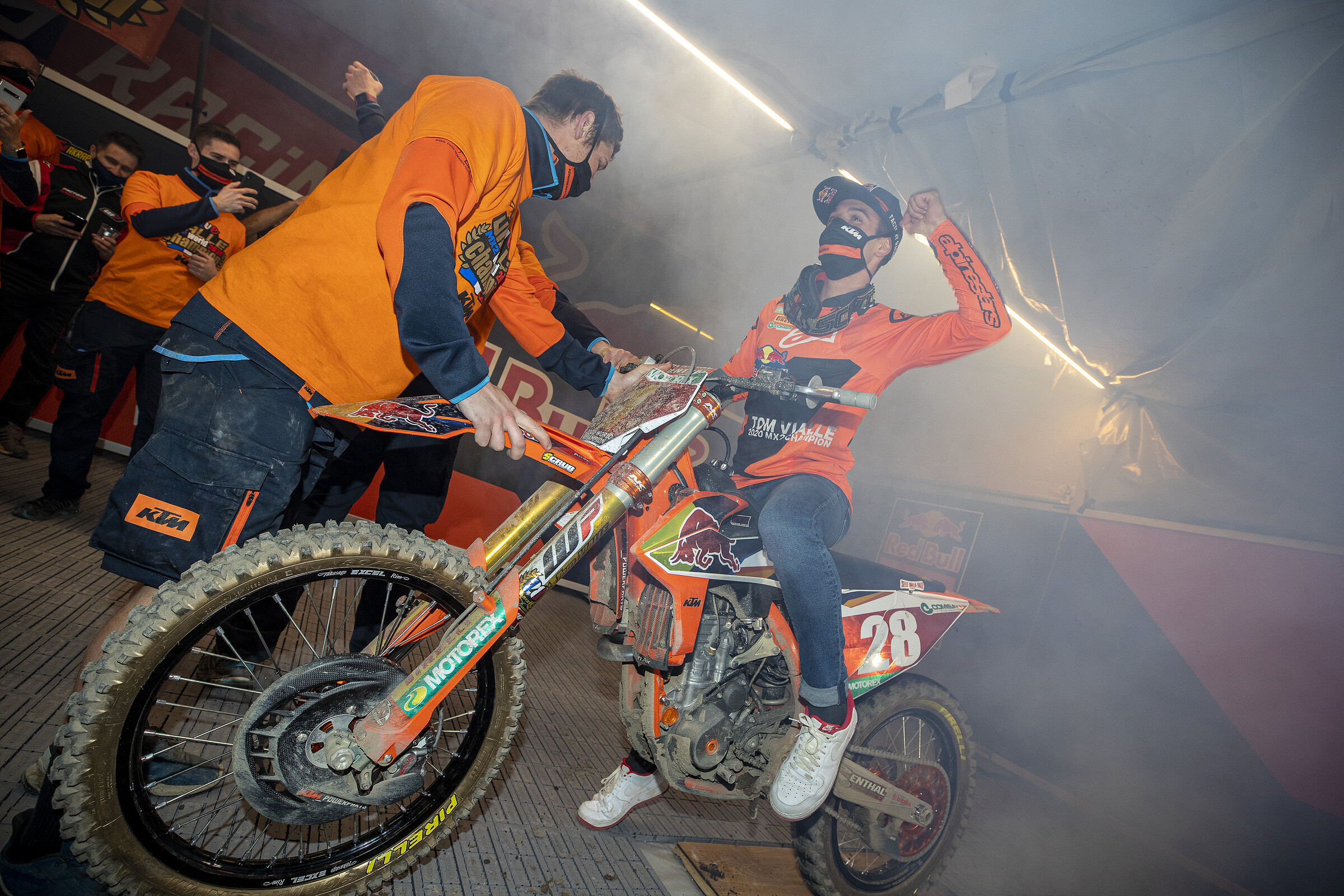 In the afternoon and as Pietramurata quickly became dark in the near-winter light, KTM released the tension that had surrounded the camp since Jorge Prado’s positive COVID-19 test. They had the obligatory burnout in the awning and the Red Bull Energy Station staged the now-annual celebration dinner but not before the entire Monster Energy Yamaha MX2 crew walked over to offer their congratulations: classy touch. The Yamaha boys had good reason for mirth with Geerts taking the Grand Prix by just one point from teammate Ben Watson; the team’s very first 1-2 result in the category.