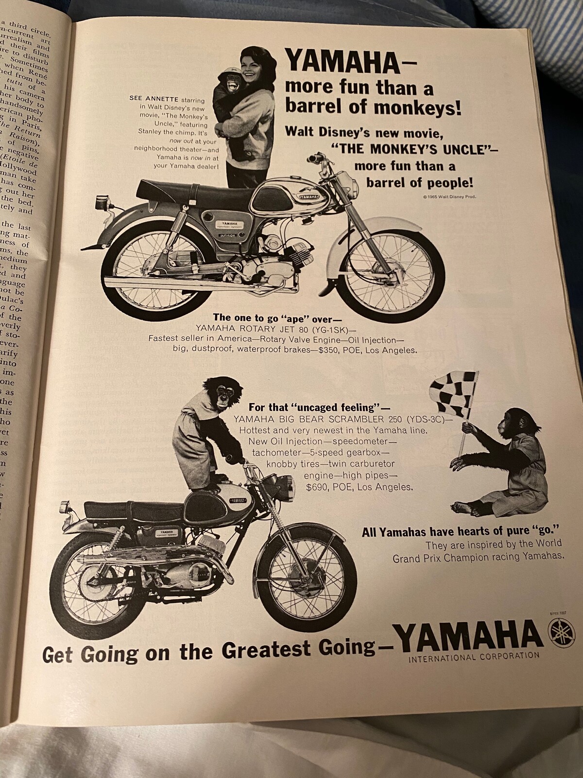Let's start with the Yamaha ad, which apparently sold you on the idea "YAMAHA—more fun than a barrel of monkeys." It was part of a Disney movie tie-in for The Monkey's Uncle, starring Annette Funicello and Stanley the monkey and the Yamaha Rotary Jet 80, which is "the one to go ape over.... For that uncaged feeling... Get going on the greatest going."