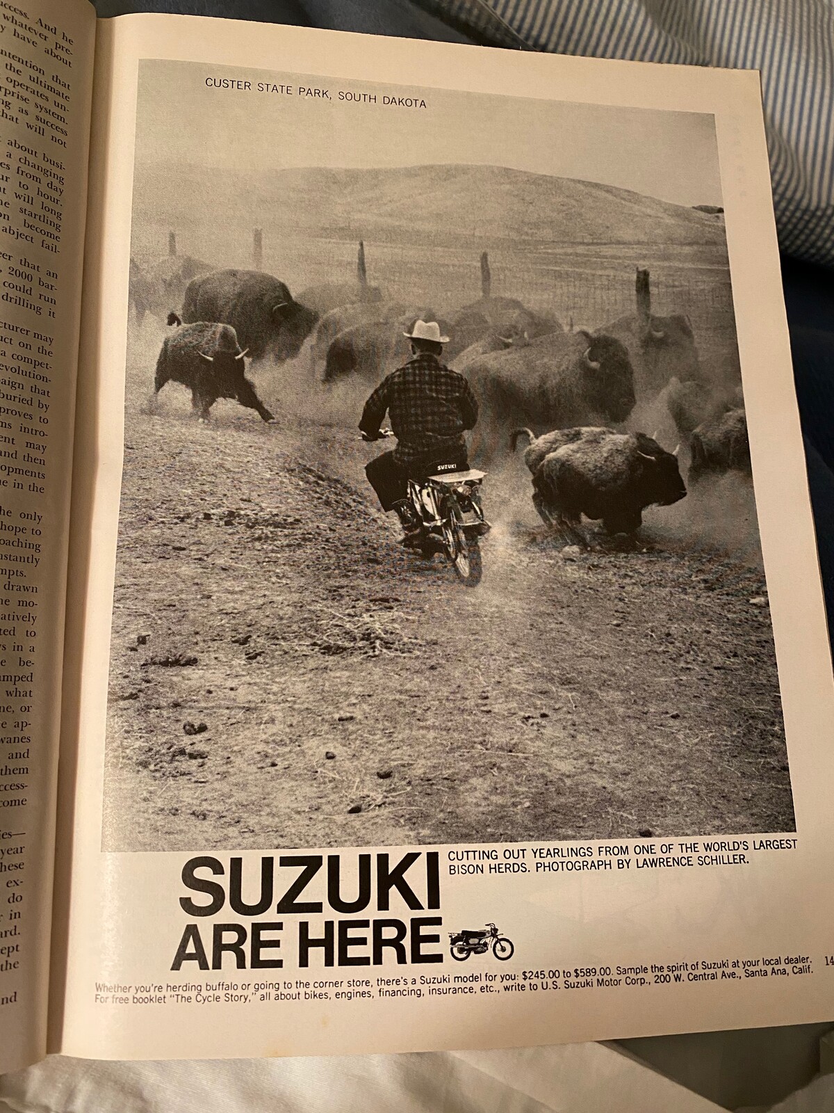 "SUZUKI ARE HERE" shouts the Suzuki ad, here being Custer State Park in South Dakota, where one could apparently use a Suzuki to round up buffalo in "cutting out yearlings from one of the world's largest bison herds." Try that today in a state park and see how fast you end up in jail. But more astonishing is the price range of the various Suzuki models: $245 to $598.