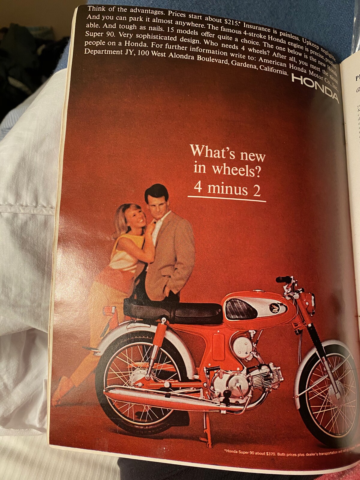 A little more subtle was the Honda ad: "What's new in wheels? 4 minus 2." The Honda Super 90 was featured, along with "Playboy Man" and his adoring gal. The ad suggested you "think of the advantages. Prices start at $215. Insurance is painless. Upkeep negligible. And you can park it almost anywhere. The famous 4-stroke Honda engine is precise, predictable. And tough as nails. 15 models offer quite a choice... Very sophisticated design. Who needs 4 wheels?" And then the most famous advertising slogan in motorcycling history: "After all, you meet the nicest people on a Honda."