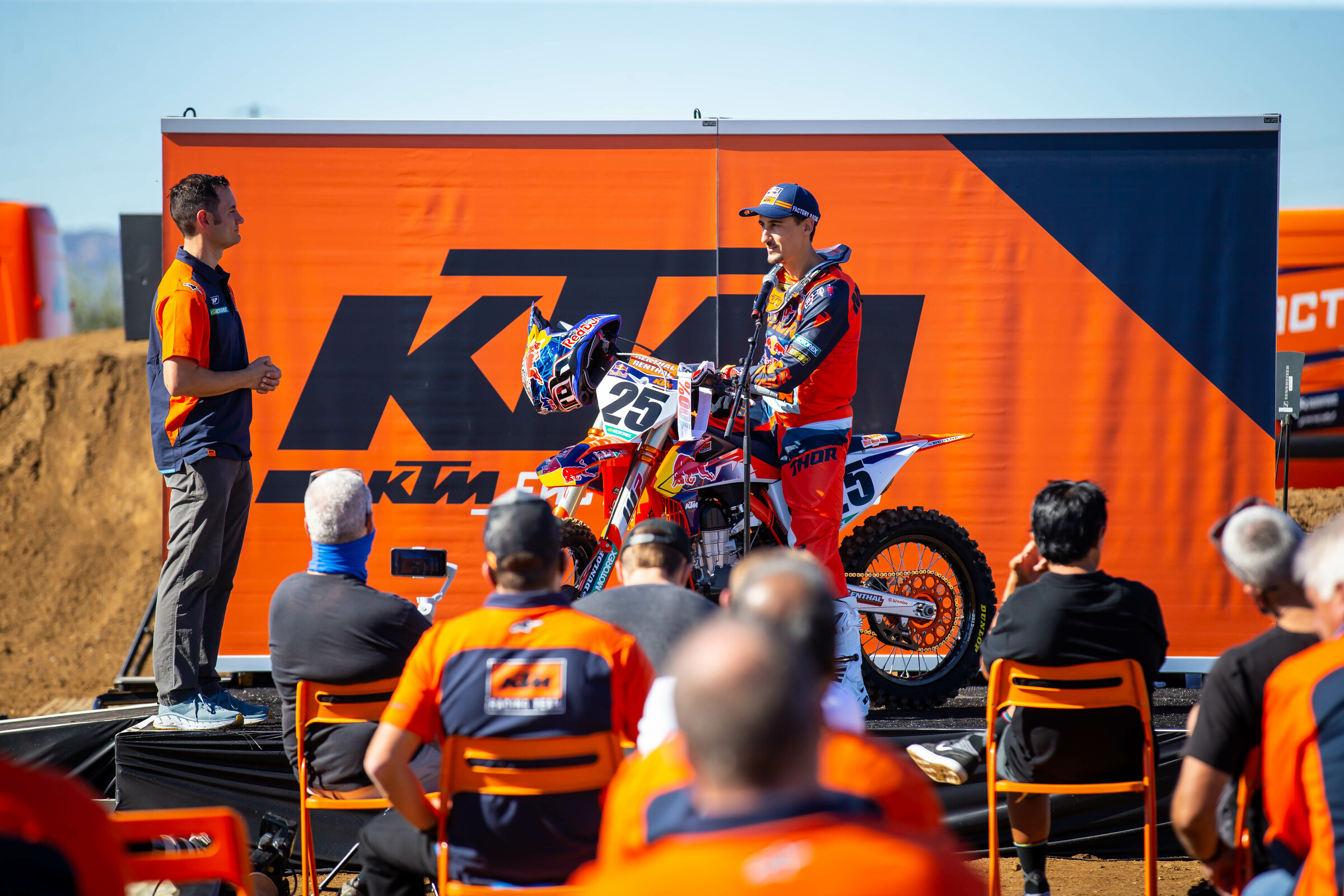 Nothing more nerve-wracking in the moto media than rocking up to the test track. Sometimes you’re welcomed, and sometimes the work is supposed to happen in secret. Worst, you’ll usually get permission from five different people to come to the track, but then there’s a sixth guy around who didn’t know you were coming and doesn’t want you to be there. But test track media is critical during this time of year because we won’t see the riders on a racetrack for months. KTM solves this problem a bit by holding a factory team launch every year at its test track. On Tuesday afternoon, Marvin Musquin, Cooper Webb, and Max Vohland (the Red Bull KTM team for 2021) and Joey Savatgy and Justin Bogle (Rocky Mountain ATV/MC-KTM-WPS for 2021) came to the track for a presentation, interviews, and some riding. I got to host the event, which was cool, and then I quickly swapped my KTM host shirt back over to a Racer X shirt to get more content. Literally. All of the riders then spun some laps except Savatgy, who literally hasn’t ridden a KTM 450 SX-F yet.
