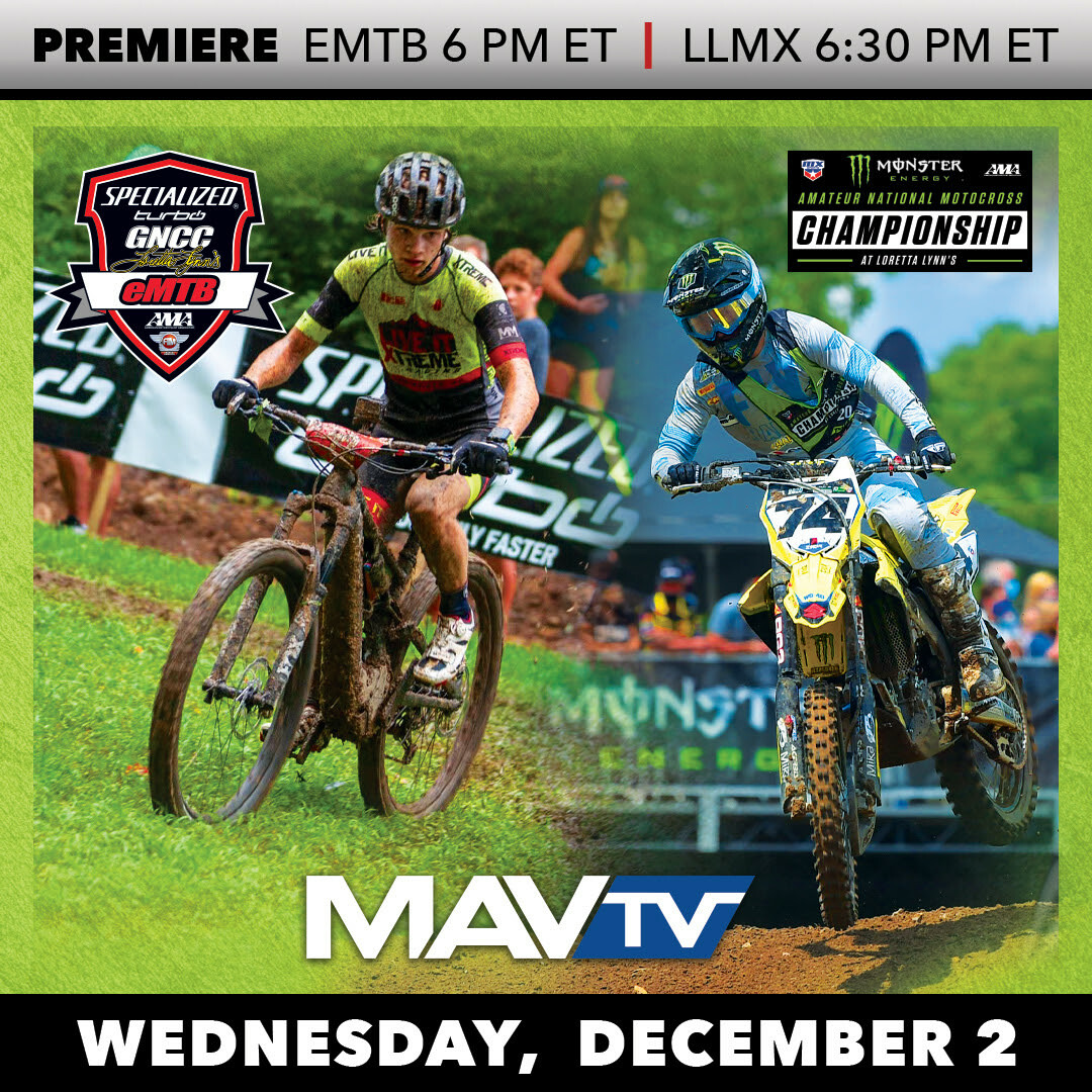 The first of three Monster Energy AMA Amateur National Motocross Championship episodes will premiere on MAVTV tonight at 6:30 pm ET. Relive all the action from the 2020 Amateur National at Loretta Lynn's with highlights featuring 250 Pro Sport moto one, rider interviews, and more. Before you watch all the action on the motocross track, check out the Specialized Turbo GNCC eMTB Race, first-ever FIM North American eMTB Championship at Loretta Lynn's at 6 p.m. ET. The motocross race follows right after, providing one hour of action from Loretta's.