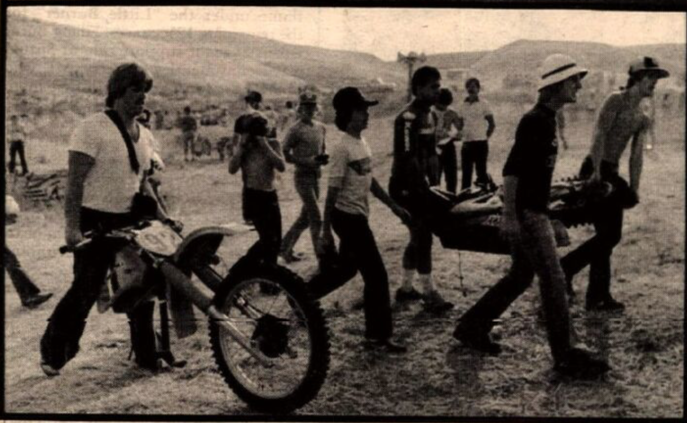 “Drop-off jumps played havoc with the heavier machinery, blowing apart wheels and frames like toothpicks. RPM rider Gary Pustelak was full throttle down a rough straightaway when his production KX 420 Kawasaki hand-grenaded its frame and the two ends parted company, leaving ‘Iron Man’ flying through the air with nothing beneath him but a prayer.”