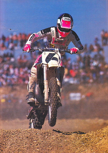 When Micky Dymond moved over from Team Honda to Team Yamaha in 1988, he brought two AMA 125 National Championships with him. What he left behind at Honda was the rather-drab HondaLine gear he had to wear as part of his contract with the Red Riders. Given a chance to change it up a bit at Yamaha, Dymond signed with Answer and put on this cool black, white and fuschia (or however you spell that) gear that really popped aboard his white YZ250s. He didn't get the same results as he did with his Honda CR125, but he certainly looked more stylish.