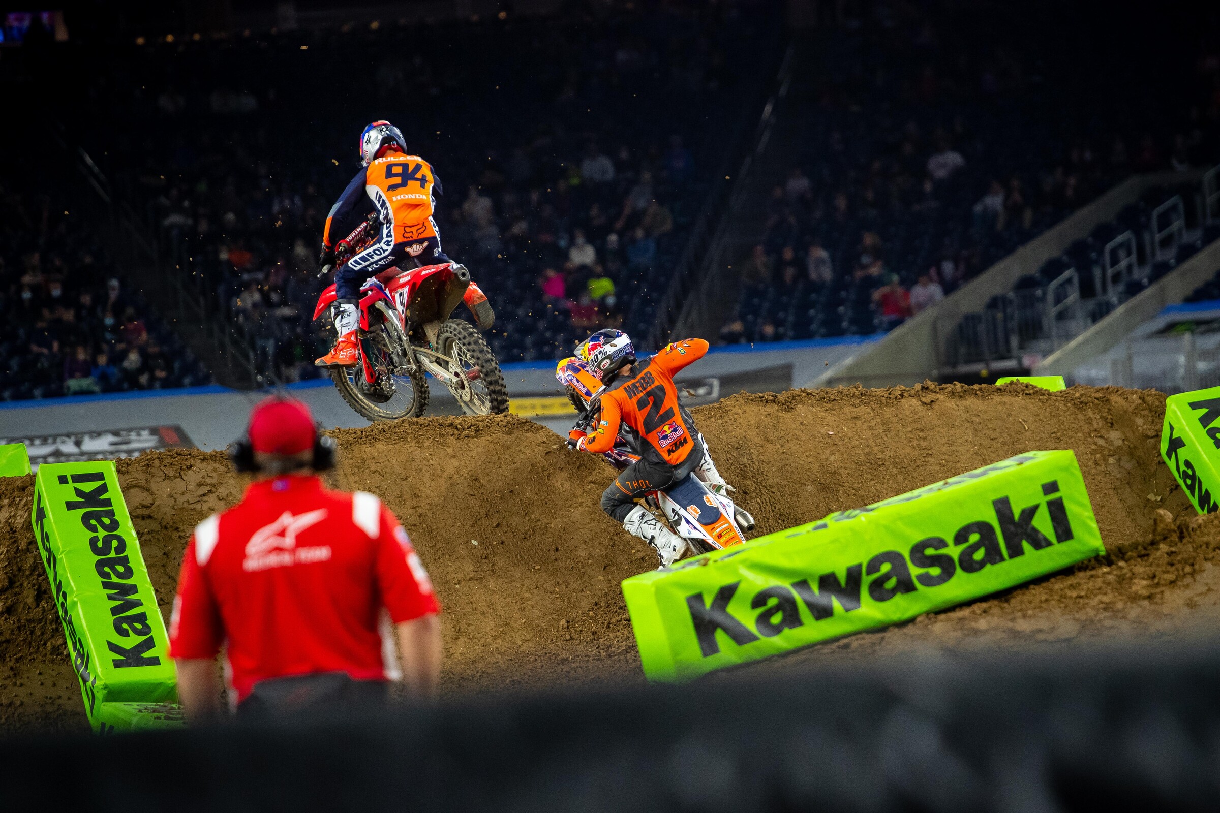 In one sense, the Houston trio of races to start 2021 Monster Energy AMA Supecross worked out well for Ken Roczen, as he heads to Indianapolis with the points lead. However, his lead could be much larger, because he was penalized four points for a red cross flag violation at round two, and then was blocked by lapped rider Dean Wilson at round three, which cost him the lead and eventual race win to Cooper Webb. That’s makes three-point loss for Roczen and a three-point gain for Webb. Now, Roczen (60 points) has the points lead with Webb and Barcia (59 points apiece) sitting close in a tie for second but Roczen could seven more points had he not been penalized at round two and then won the main event on Saturday.