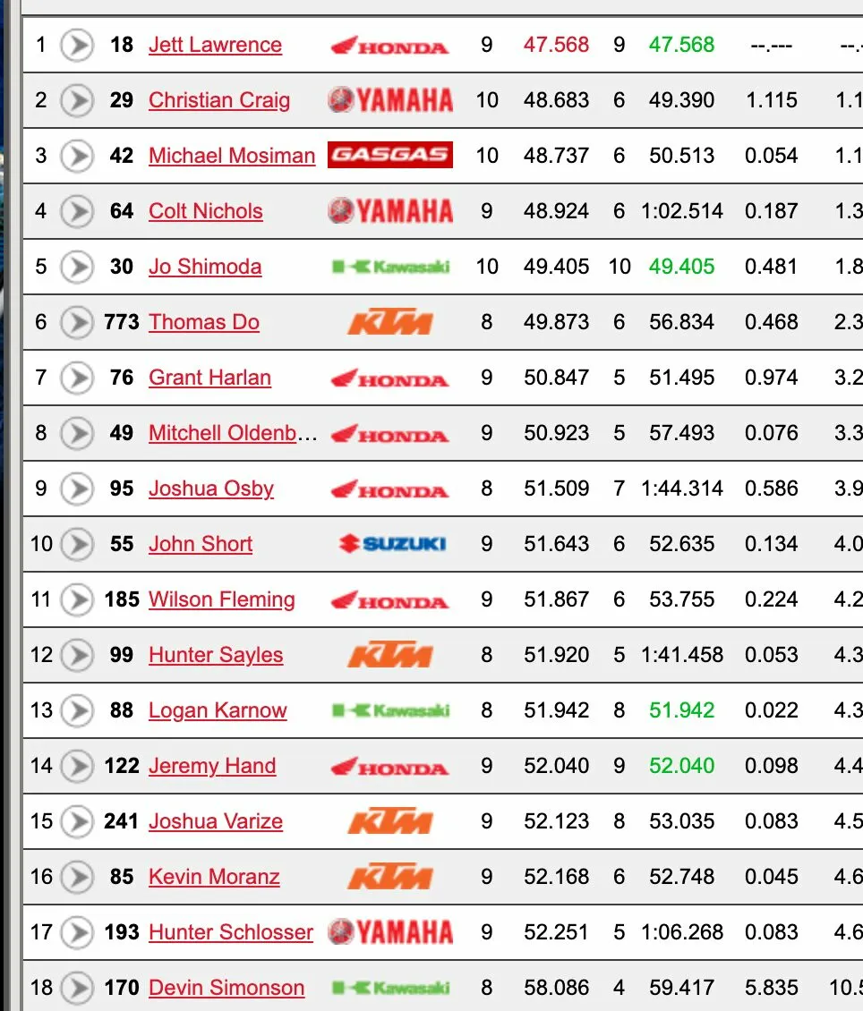 In 250 seeded, Christian Craig jumped to the top of the charts early, while Jett Lawrence cruised around toward the back before starting to put in hard laps. Once he did, though, he was on the gas and Lawrence went to the top with a big gap over Craig. Then Shimoda—who hasn’t done his best work in practice—moved to second.