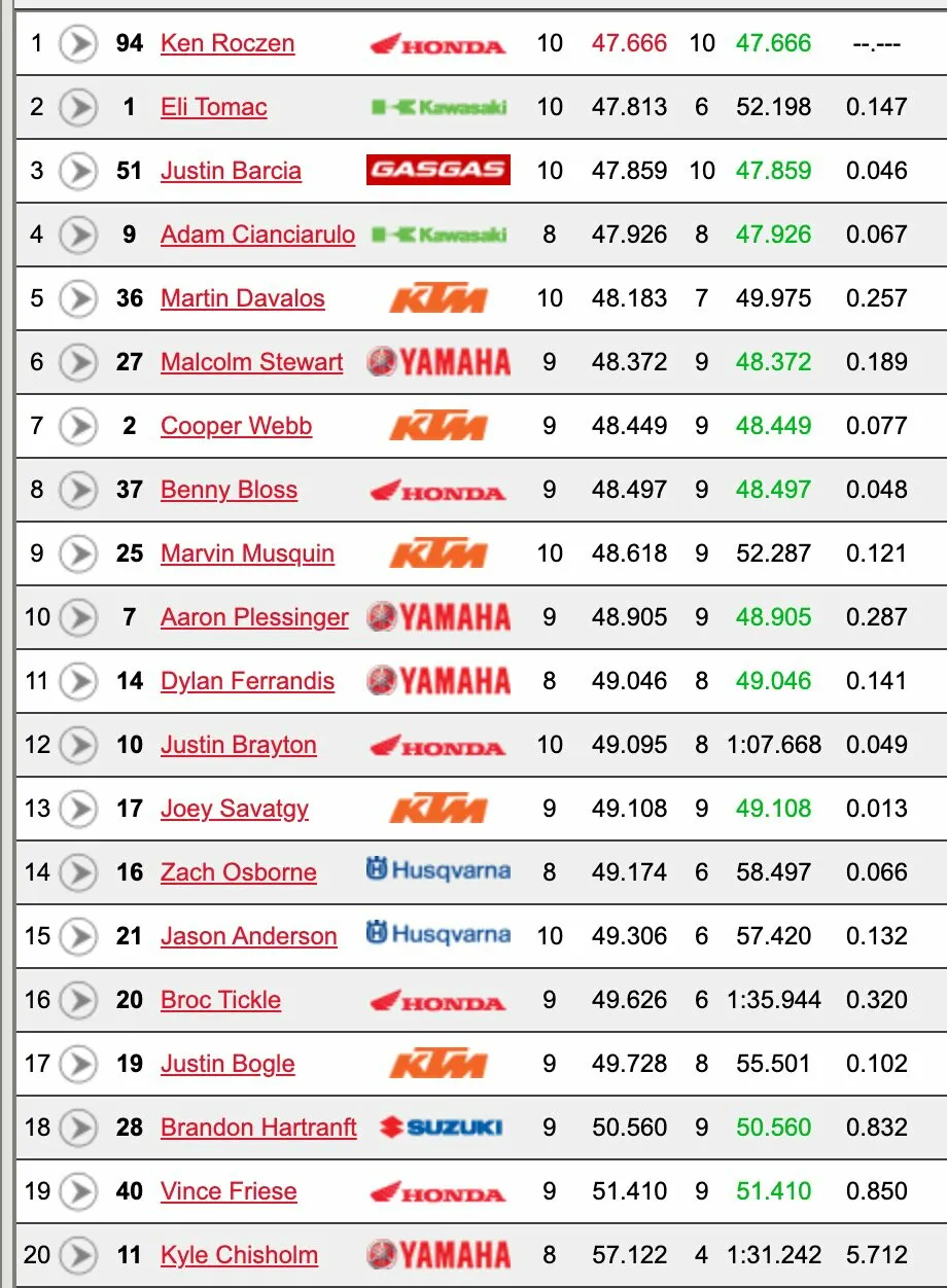 | 2 | Justin Barcia | +01.981 | 0:47.005 | Monroe, NY | GasGas MC 450F | |
