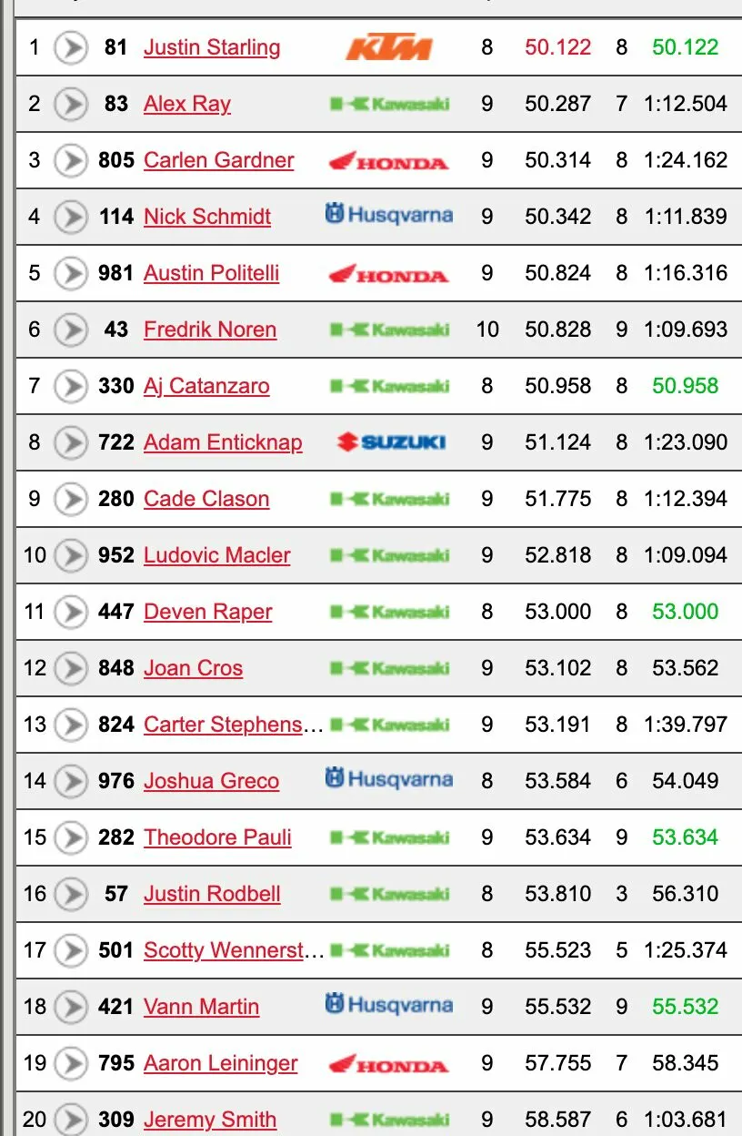 | 5 | Justin Starling | +07.912 | 0:50.792 | Deland, FL | KTM 450 SX-F |