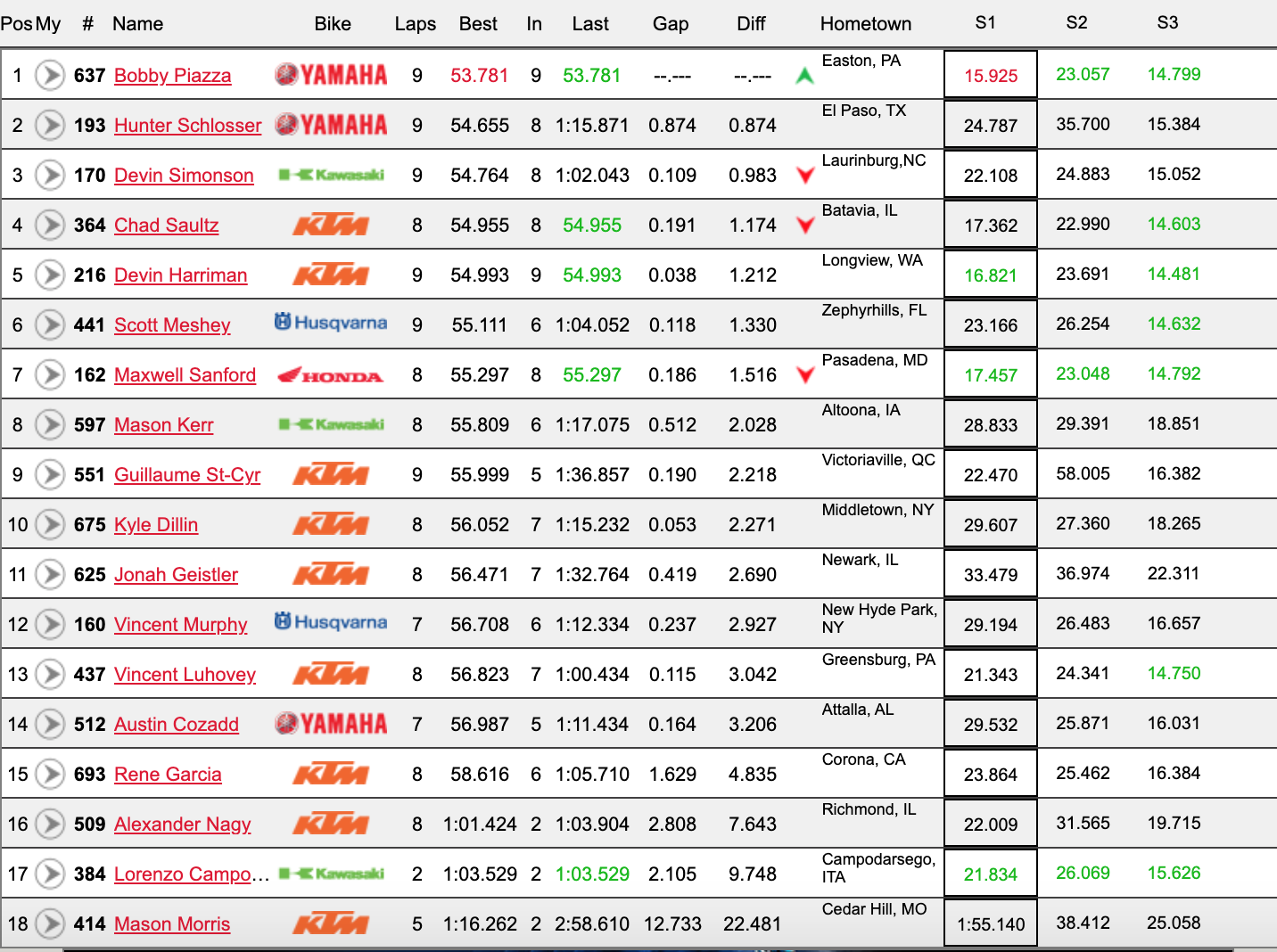 | 5 | Adam Cianciarulo | +09.025 | 0:49.351 | Port Orange, FL | Kawasaki KX450 |