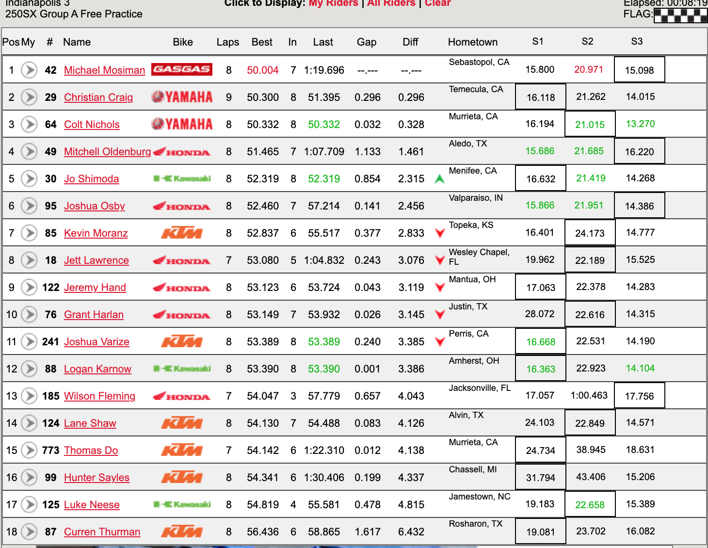 In 250 A, Christian Craig won the “fake start” and was the first rider on track. Michael Mosiman went to the top of the lap charts quickly, though. Craig logged a fast lap late but Mosiman remained on top. Then it was Nichols, Oldenburg, Osby Moranz, Lawrence, Hand and Harlan. Lawrence, probably in pain, did not finish that session.