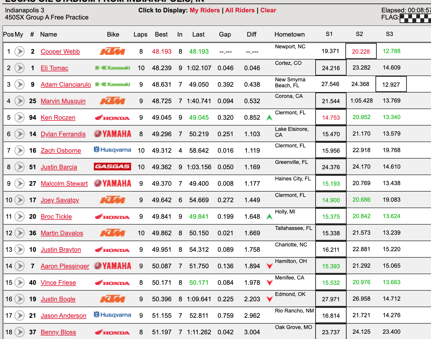 Before Webb logged his fast time, Adam Cianciarulo was at the top of the board, he ended up third, then it was Stewart and Roczen, Osborne, Ferrandis, Tomac, Savatgy and Anderson, which is impressive since he couldn’t even ride the other day.