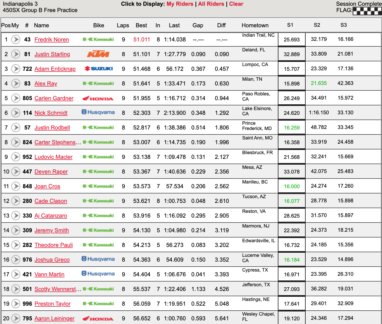 It was Starling, Enticknap and Noren at the top of the board early in this 450 B group. Carter Stephenson went down on a jump and that led to a red flag, the track crew got out and smoothed some of the ruts before the session resumed. Cade Clason put in a fast time late to make some noise.