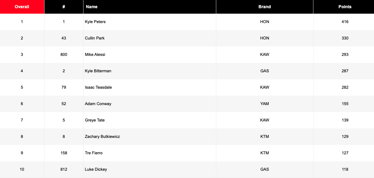 | 7th | Cory Carsten | Husqvarna | 16 |