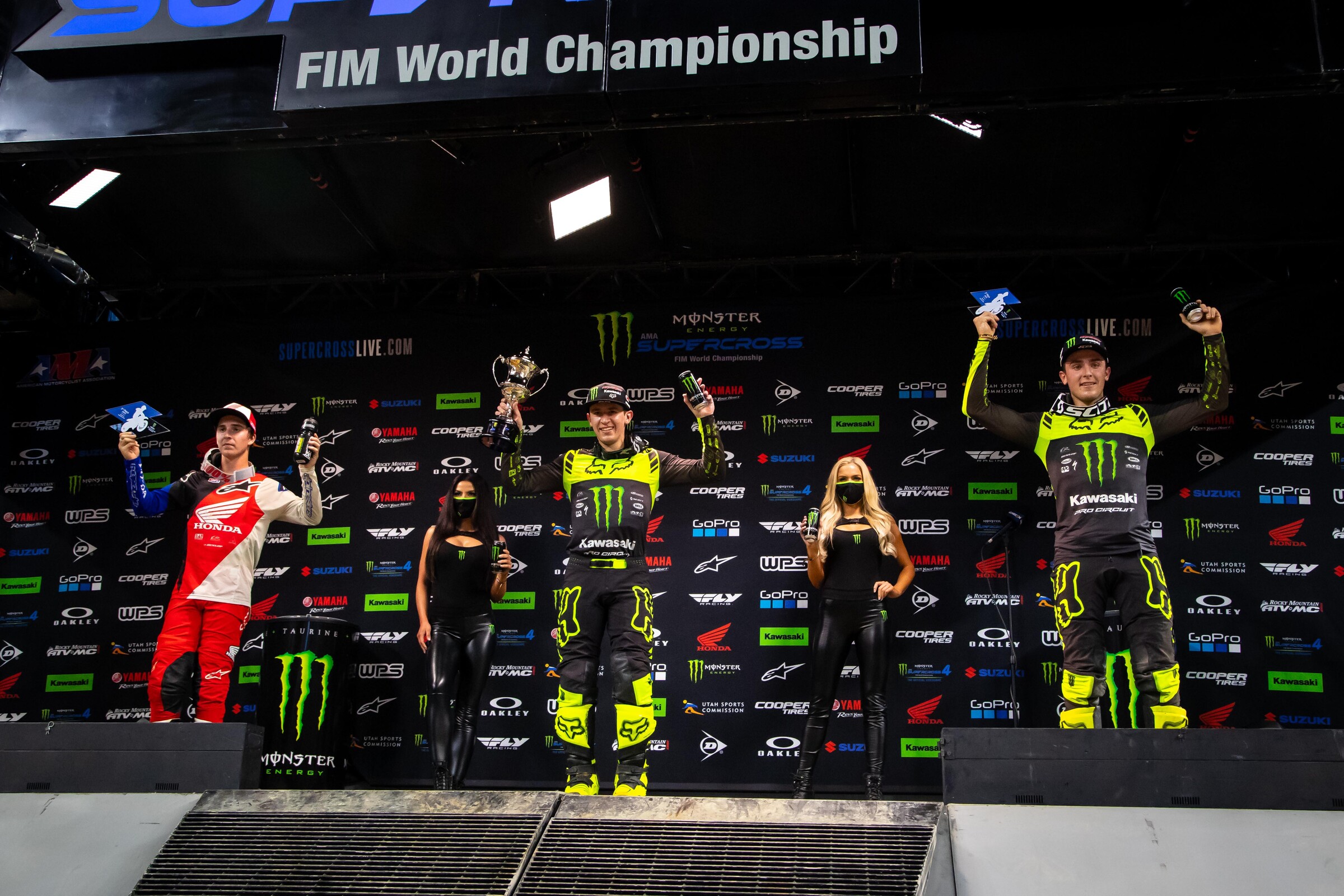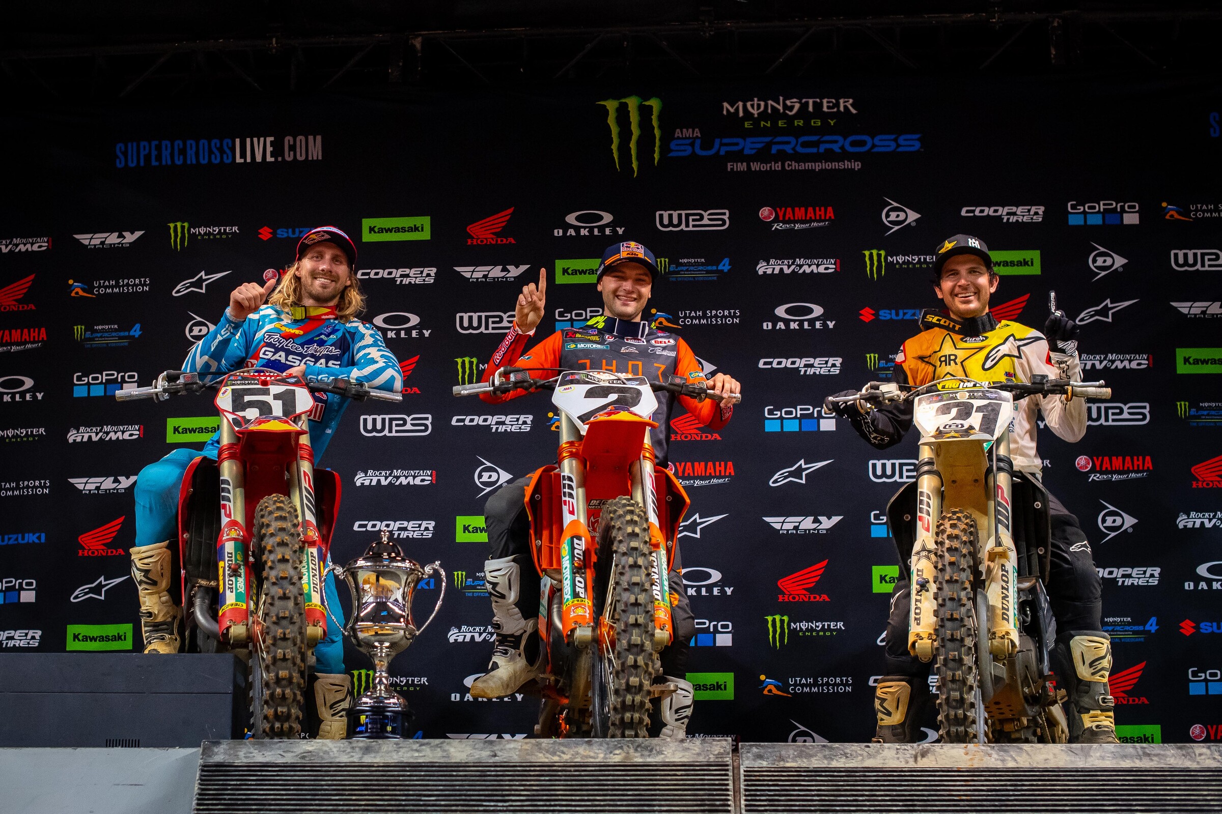 Sandwiched between was Hunter Lawrence who found himself on a supercross podium for the first time in his career. The Australian had his fair share of injuries as well in the last few years that kept him sidelined for supercross, but the second-place finish on the night was certainly an example of why Honda wanted to pull him from MX2 in the first place to come to the USA.