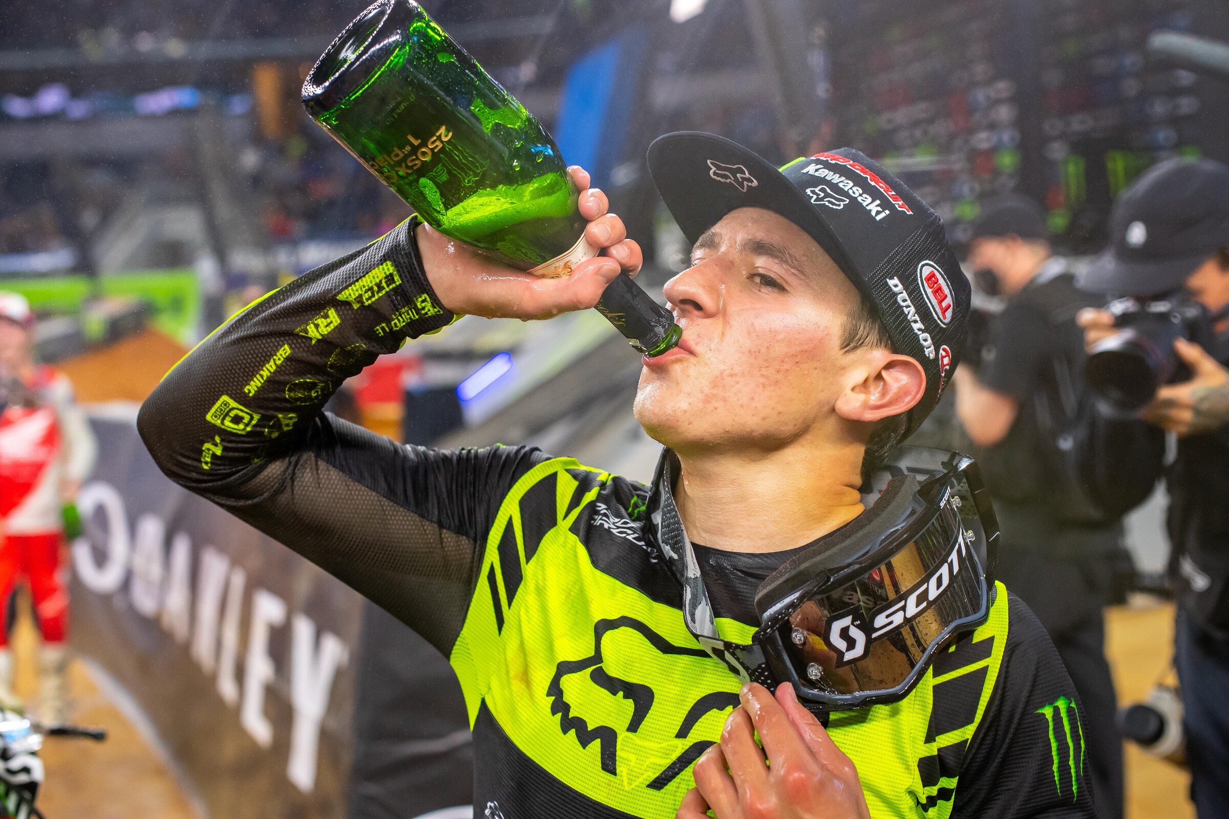 I don't know. We’re all just hanging out, having a good time. Just soaking it all in. That’s really what I’m trying to do. First race win, soak it all in. Definitely going to celebrate with the team. It just feels so good. All the hard work they’ve put in and to pay them back like that. Two weeks in a row for Monster Energy PC, so pretty sweet.