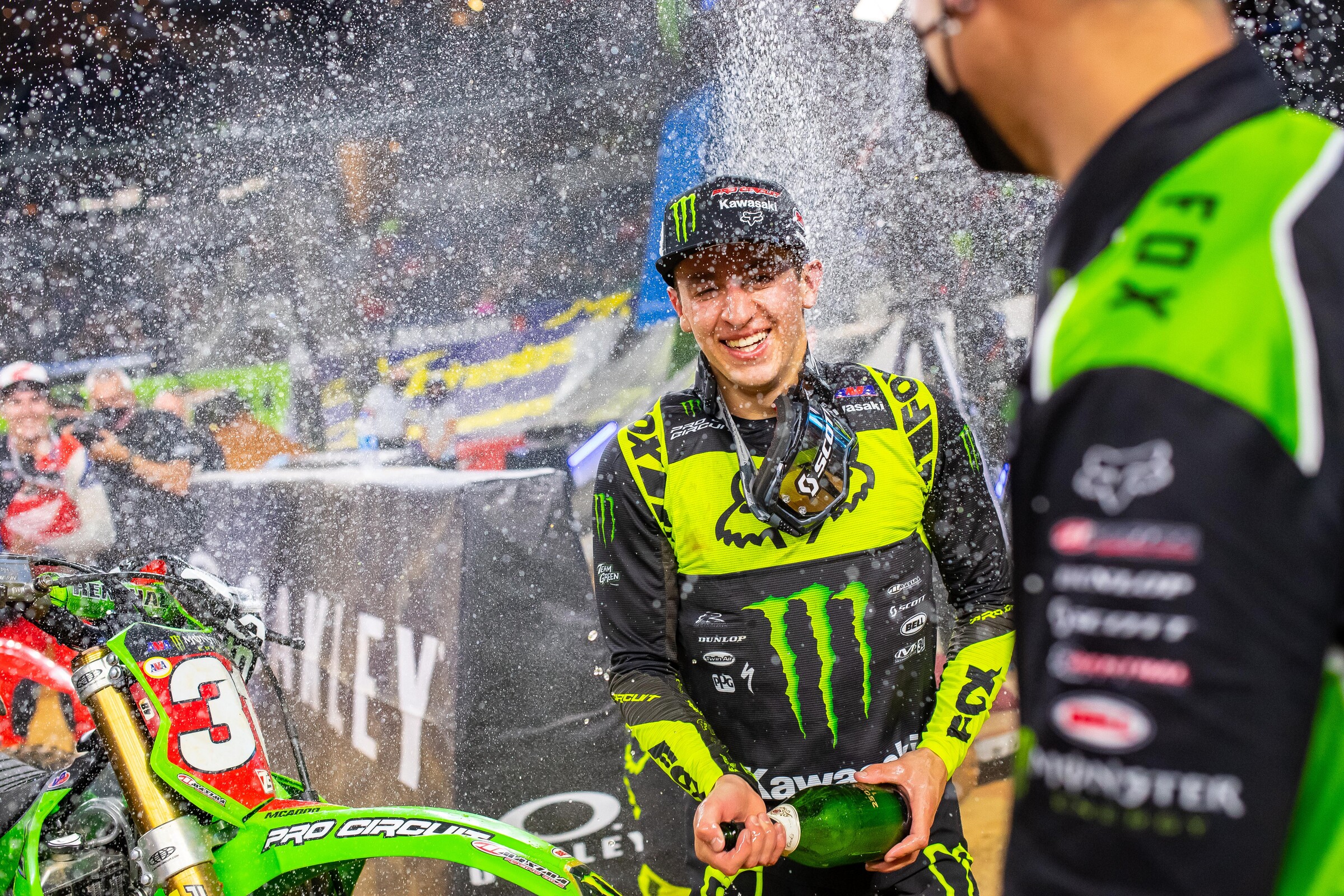 Arlington 1 was a huge night for Monster Energy/Pro Circuit Kawasaki rookie Seth Hammaker. The 20-year-old burst out of the gates to grab the holeshot and put together a masterfully managed race to lead every lap en route to his first career victory. The win comes in just his third professional start after several years of frustrating injuries and ailments during his amateur career that delayed his pro debut. Now he’s a winner and suddenly a whole different talking point just three rounds into the 2021 250SX West campaign.