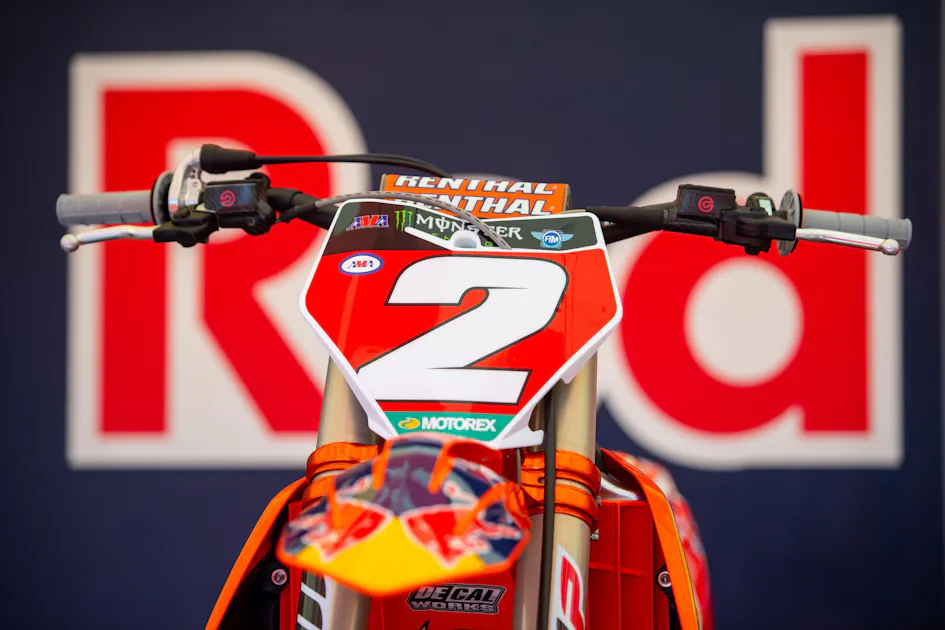 ![Cooper Webb's KTM 450 SX-F newly equipped with red backgrounds.]()
