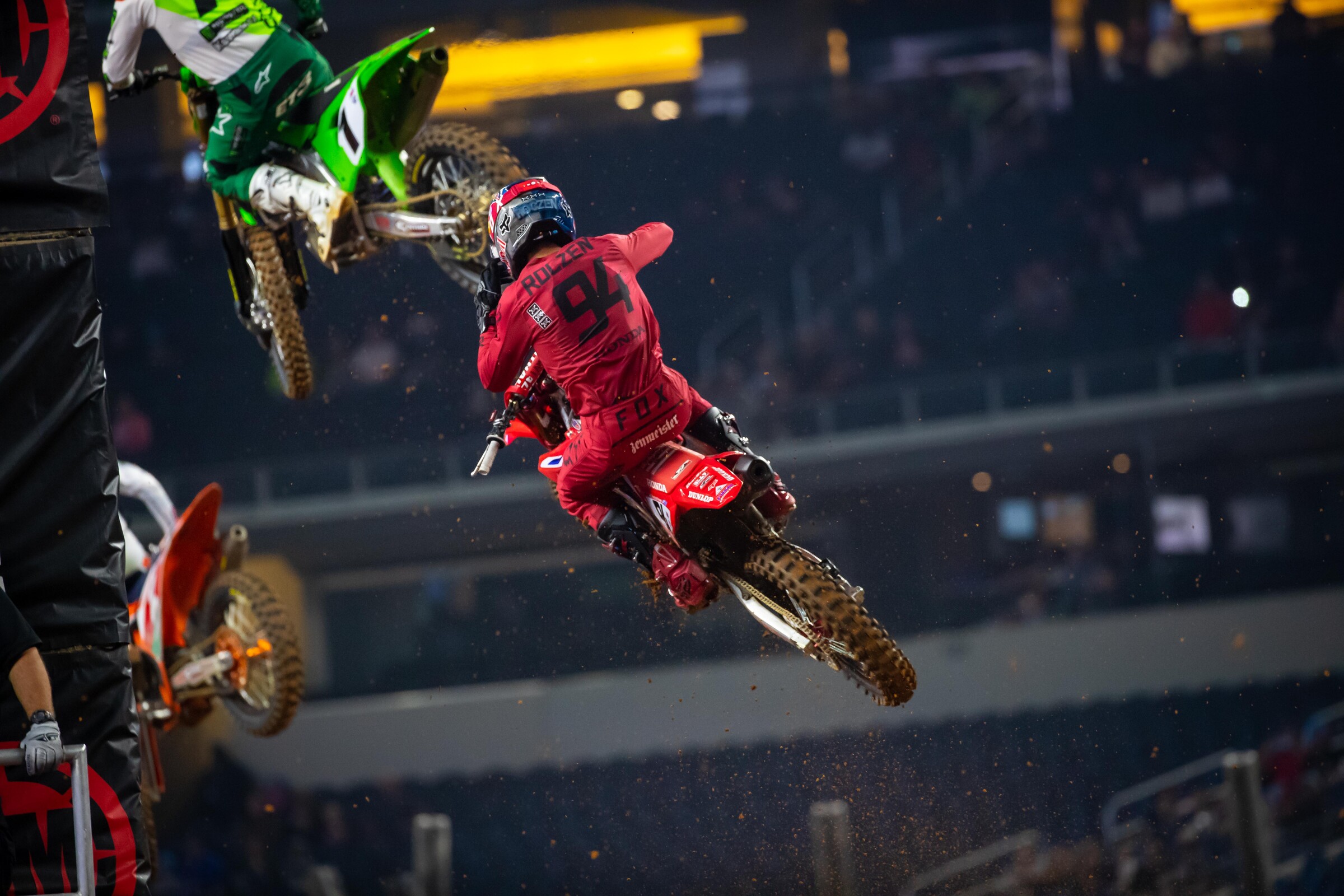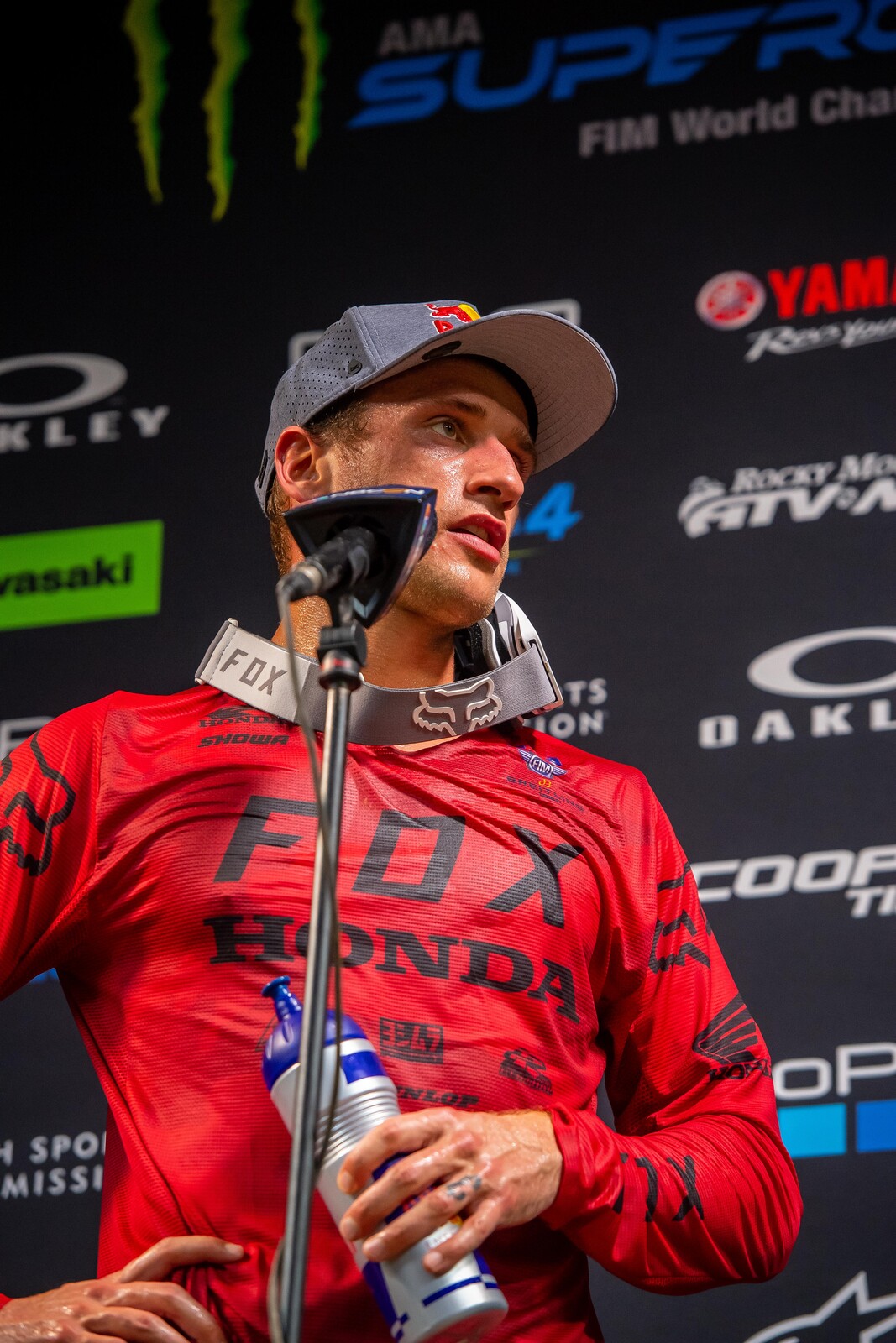 Obviously, he’s [Cooper Webb] on it right now. Realistically, the only bad race I had was last weekend and points can turn around quickly. He was winning and I was in sixth or seventh or something like that, but that was my only bad race this year. We’ve still got six rounds to go, and I just want to focus on myself. The red plate, of course it’s a nice little something to have on the bike, but in the end is when it counts and I’m keeping the dream alive, and of course he’s winning a lot right now, but I just want to go out there and do what I love and see if I can get back closer at least, so we can have a good battle all the way to the end. Essentially, I got a much better start tonight. Obviously, I wasn’t good enough tonight, but in general I’ve been having good starts except the last one. Obviously, I got screwed over in Daytona a little bit, but even before that [the starts were good] and even Daytona, that faked it a little bit, because I wasn’t on the podium just because I got shuffled back. I felt like I was strong and riding decent, and all the rounds before I was riding good. So I’m just going to keep my head up and keep chipping away, you know? That’s all I can do on a weekly basis, anyways. Luckily we have some races to go, so yeah, back at it Saturday and try it again.
