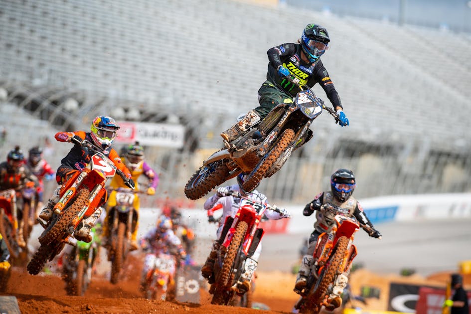 The supersized supercross experiment at Atlanta Motor Speedway is now one race deep, and we already need more. Moving Monster Energy Supercross in Atlanta from the domes to the infield of a NASCAR track offers more room (and tons, literally, of free dirt) that offered up a “supercross on steroids” size track. There’s great potential, but it’s hard to judge it from this small sample size, which ended up dodging rain all day. Three practices got cut to one, and the heat races were a slippery mess. By the main events, the track turned out pretty good, but we’ll have a better gauge of how this looks once this three-race set here is complete in a week.