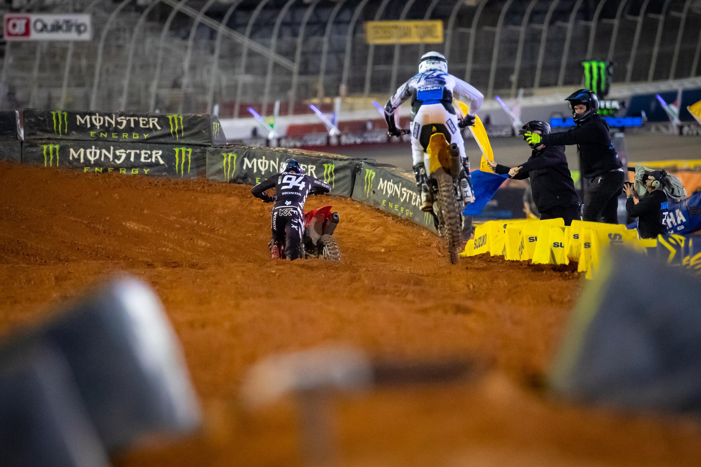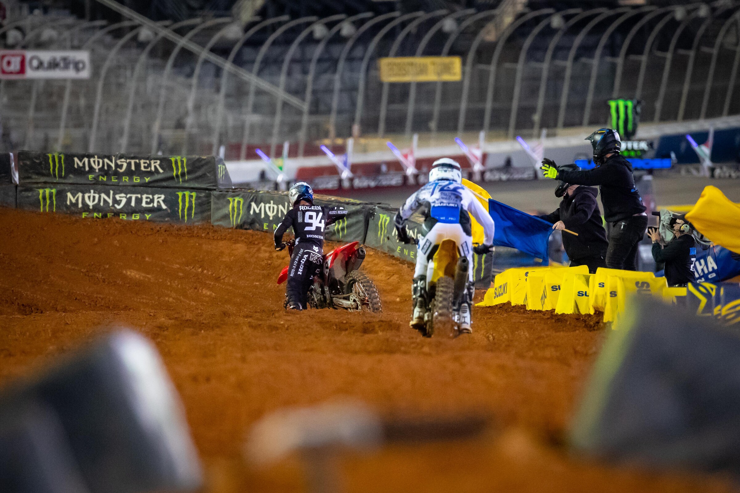 Ken Roczen snagged his fourth win of 2021 on Tuesday night at Atlanta Motor Speedway and finally put an end to the consistent bleeding that championship leader Cooper Webb had managed to inflict on his championship hopes. From the gate drop at round seven in Orlando all the way up to the checkered flag at round 13 at Atlanta 1, Webb had turned a 16-point deficit to Roczen into a 22-point lead. That monumental 38-point swing included five wins in seven races for Webb and he outscored Roczen at every race. Roczen’s Atlanta 2 win brought the lead down to just 13 points again when the metal pounded the dirt again at Atlanta 3.
