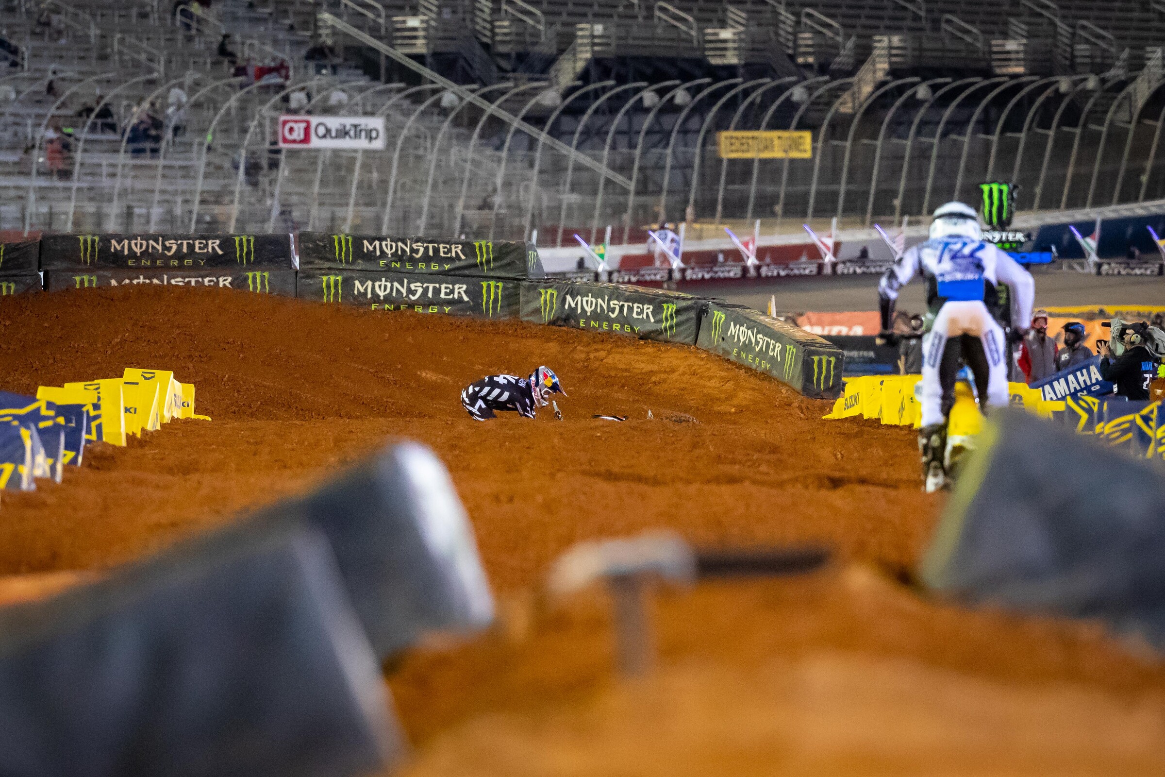 “It was weird. I hit the whoops really good pretty much almost every single lap,” said Roczen. “Once I started swapping sideways like that, it started getting so bad in that V right there and I really had nowhere to go, so I went down. Even though it wasn’t a high-speed crash at all, but I got the handlebars so that they were a little bit tweaked. That definitely took me some getting used to. It kind of just took the wind out of my sails a little bit.”