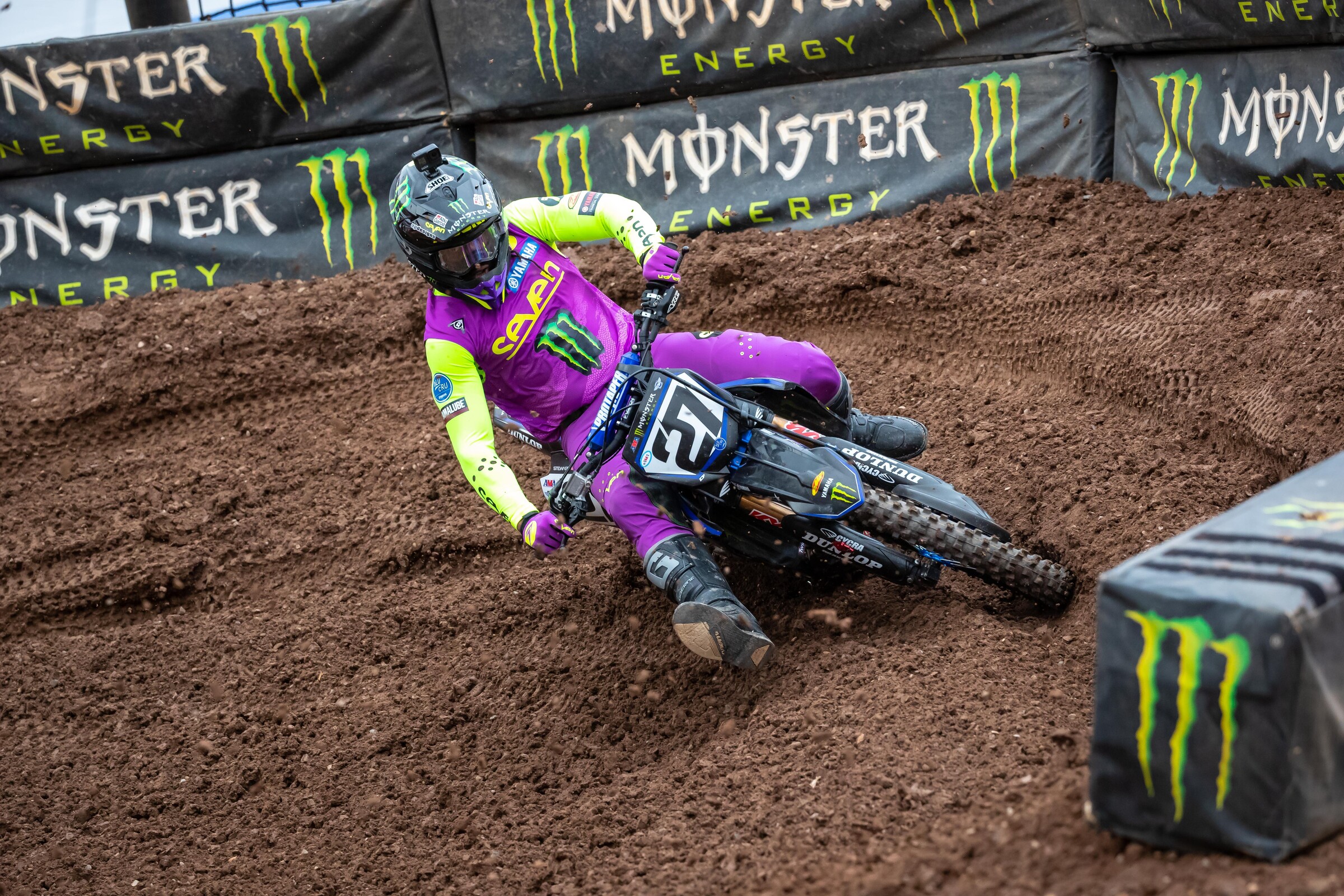They were! They were just big enough to disallow jumping as a viable choice, forcing riders to blitz deteriorating whoops at the end of the main event. Even more tricky, the SLC dirt has a unique make-up that likes to create wheel spin. The rear tire was spinning and deflecting off of each whoop, making it difficult to drive forward and worse, reducing predictability. That difficulty was evident as many riders would hesitate on entry, the tell-tale sign of difficult whoops. Had there been more traction and less deterioration, riders would have exited that berm with reckless abandon and accelerated into the first whoop with full force. Instead, we saw half measures for most of the field. Unless you’re Mookie. Then you just send it.