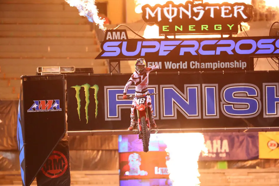 In the 250SX East division Colt Nichols came into the night in a position similar to Webb’s. He had a big points gap, and finishing twentieth or better was good enough for a championship. But, like Webb, it didn’t prevent Nichols from going for the win, and it’s a good thing he went for it on the start, otherwise he may have find himself collected in the pileup that claimed multiple riders. Instead Nichols nailed the holeshot, stayed ahead of the carnage, and found himself gapping the field early on. A hard charging Jett Lawrence would eventually track him down and take over the lead, but Nichols brought it in for second place to win the 250SX East championship.