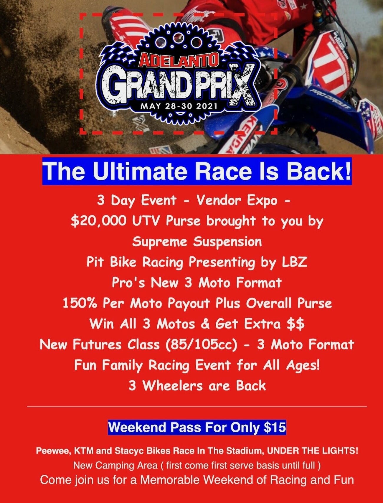 And if Lucas Oil Pro Motocross is not your cup of tea for the weekend, they're having a big off-road event out at Glen Helen, the Adelanto Grand Prix. Lori Bryant, the track manager, told us this week they have been getting a huge turnout of little kids on Stacycs, which is great news for our collective future.