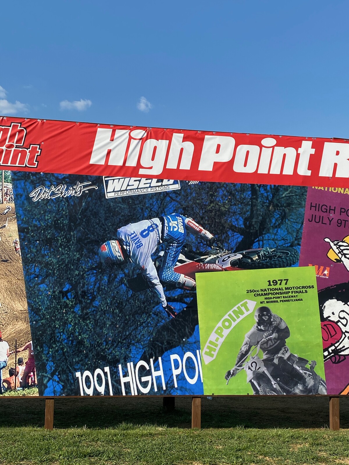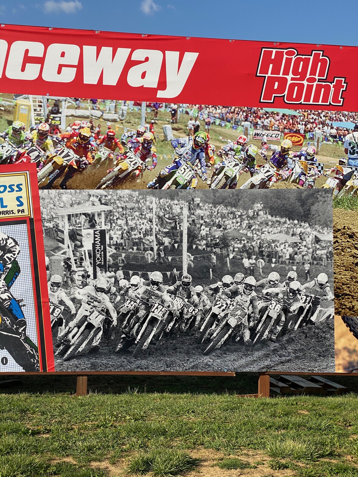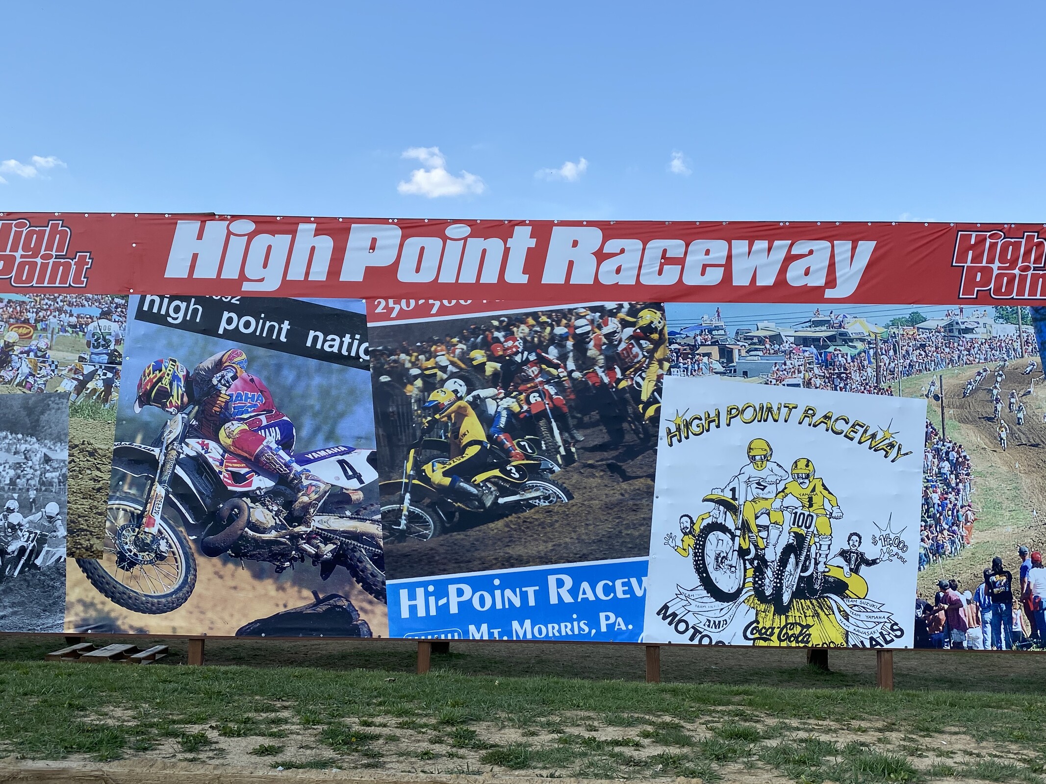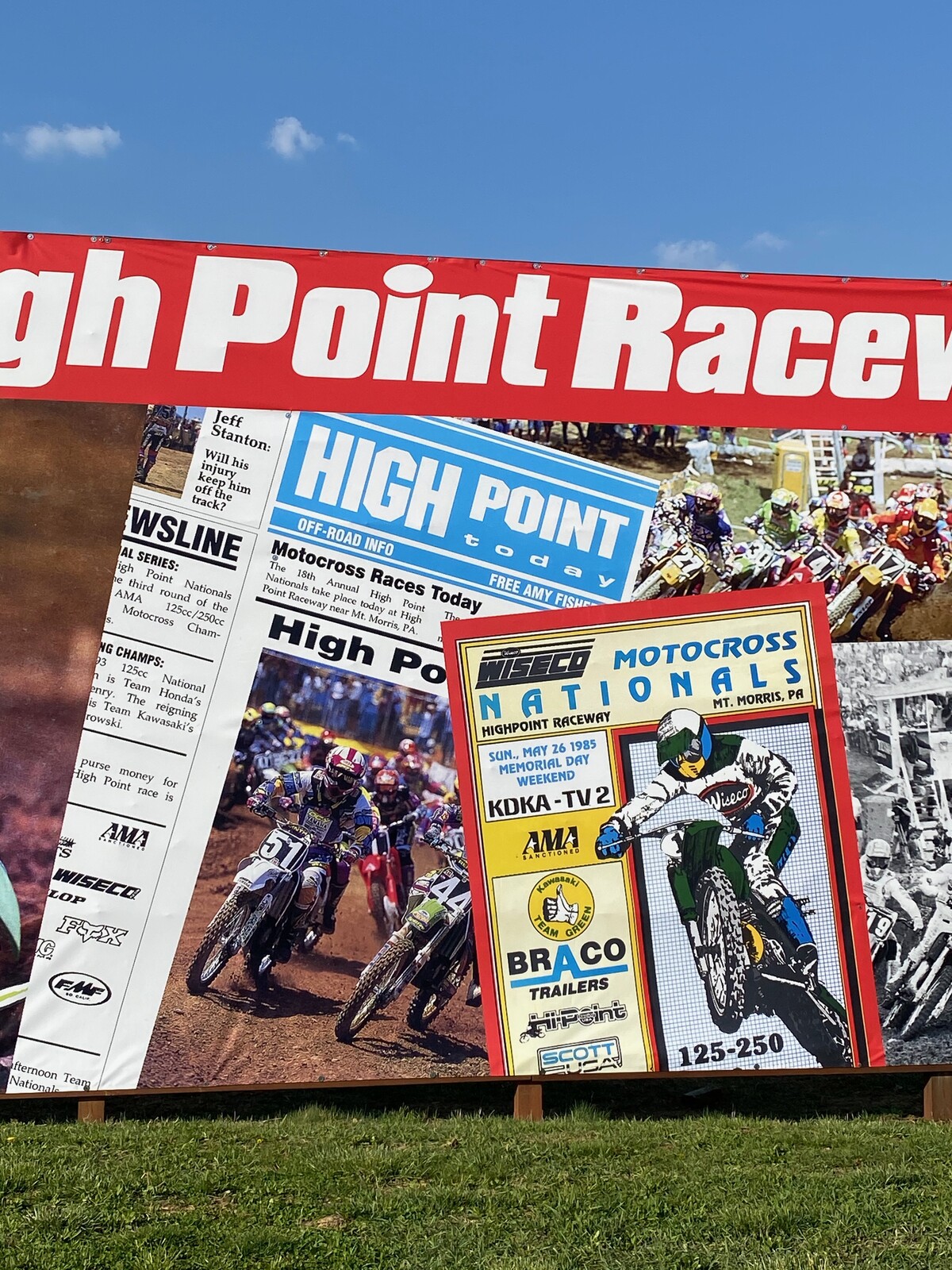 Earlier this year, we unveiled the brand-new historic backdrop behind the starting gate at High Point Raceway. It celebrates the history of the track, which was founded on the Holbert family farm in Mt. Morris, Pennsylvania, in September of 1976. One year later, High Point held its first outdoor national, and it has remained on what’s now the Lucas Oil AMA Pro Motocross Championship schedule every year—with the exception of 2020, when statewide COVID-19 restrictions barred large gatherings. During last year’s shutdown, we decided to do something cool to celebrate the history of High Point Raceway, so we asked Racer Productions graphic designer Heather Moebus to come up with a collage of old photos, pit passes, and program covers for the backdrop—something we saw done extremely well at the famed Assen TT circuit in the Netherlands at the 2019 Motocross of Nations, as well as the excellent “wall of fame” at Unadilla. High Point returns to the schedule this weekend for what will be the 44th Annual Pro Motocross event here, we thought we’d go into a little detail of just what each of those images mean for this week’s list. I’m going to try to do it in chronological order, but bear with me—there’s quite a bit of family history in here as well.