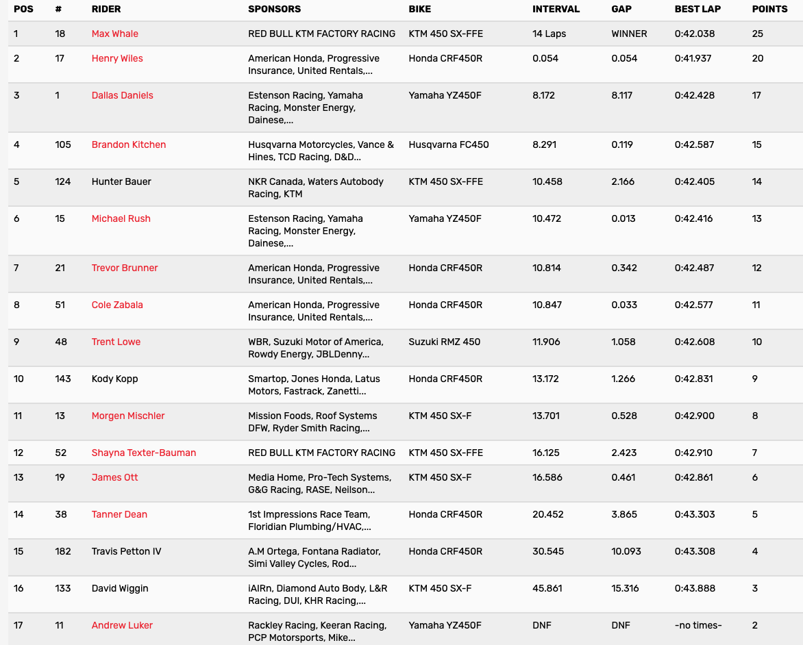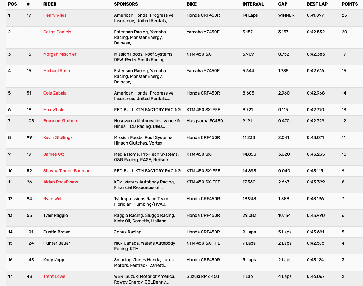 | 4 | Colt Nichols | Muskogee, OK | 2 - 5 | Yamaha YZ250F |