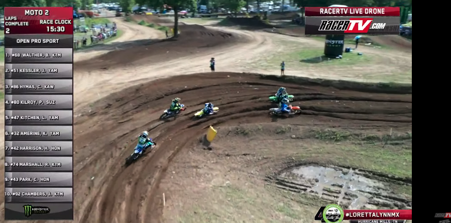 Open Pro Sport Overall Is...Still Open: In the first Open Pro Sport moto, Levi Kitchen won the race but was officially credited third due to jumping on a red cross, bumping Preston Kilroy and Chance Hymas from second and third to first and second, respectively. He really needed to win the second moto to help his title chances, but starting about 35th place didn’t help his cause. No matter for Kitchen, he just turned up the heat and launched an amazing come-from-behind charge. Jace Kessler came through turn one ahead of Kilroy, Harrison, and Justin Cokinos as Kitchen came through about 29th. With Kilroy in the lead and Kitchen and Hymas way back, things were looking good for the Suzuki rider…until he caught his break lever and went down on lap one. Meanwhile, Kitchen and Hymas (riding 250s against a field of mostly 450s) were moving forward. Kitchen soon charged to inside the top 20. Then he made his way into the top 15...then the top ten. By the end of the first lap, he was eighth, just behind Hymas. Hymas had to put in a charge of his own, as he started outside of 15th. Out front, Brandon Walther took the lead from Kessler, who was shuffled back as the top five tightened up together. They were all in the turn after the Ten Commandments jockeying for the lead!