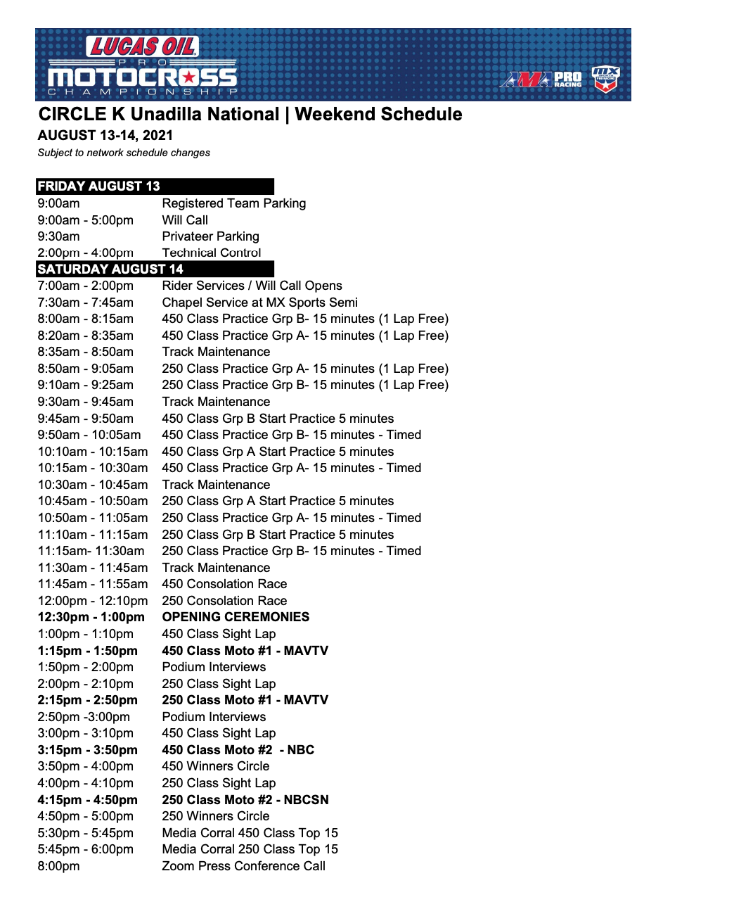 The eighth round of the 12-round 2021 Lucas Oil AMA Pro Motocross Championship will take place on Saturday, August 14, at Unadilla MX in New Berlin, New York.