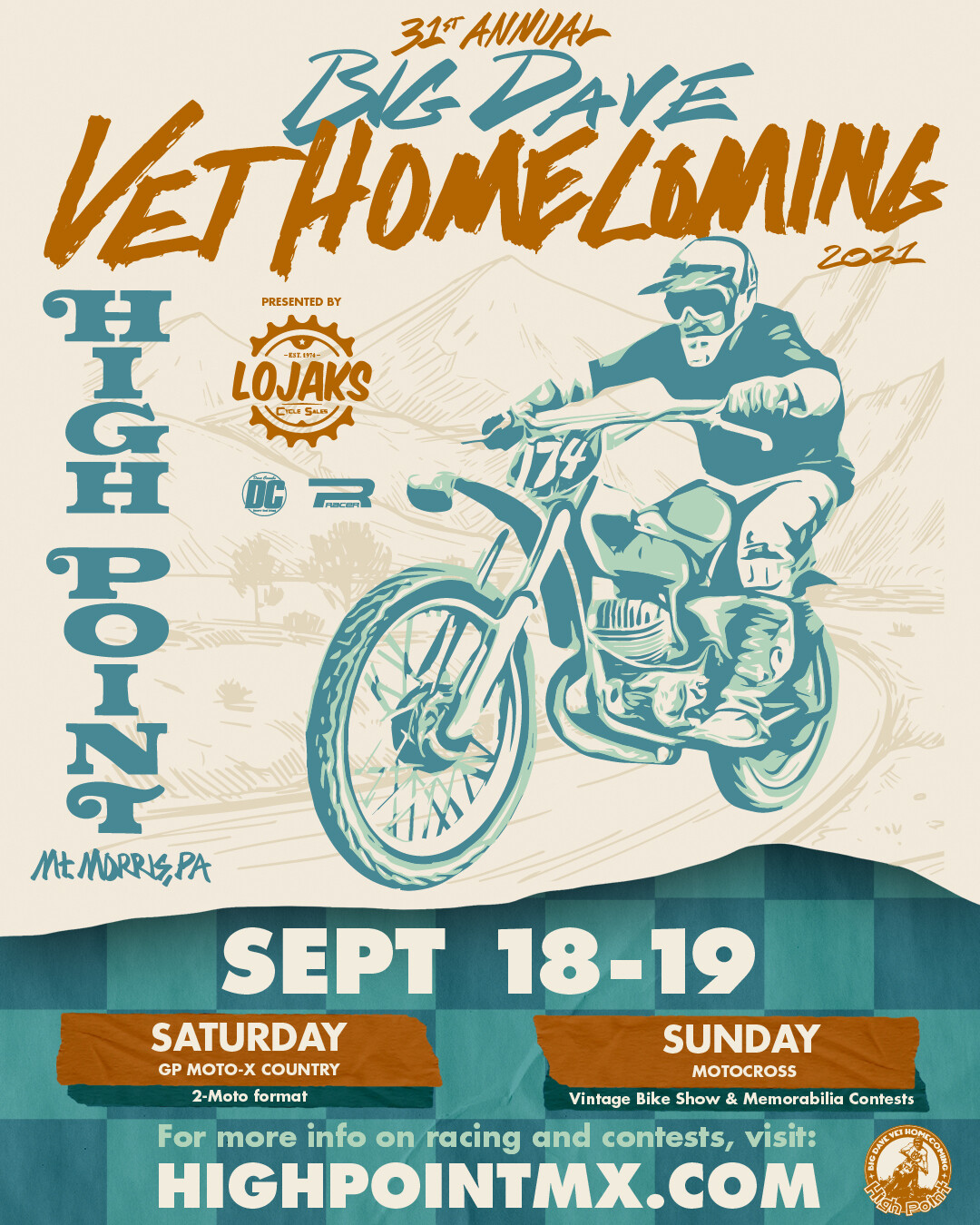 Sunday the focus will shift to the motocross track as the 31st Annual Big Dave Vet Homecoming will take to the famous High Point Raceway. Racers will be able to compete in numerous Vet-aged classes, Vintage classes and some Support classes for younger riders as well.