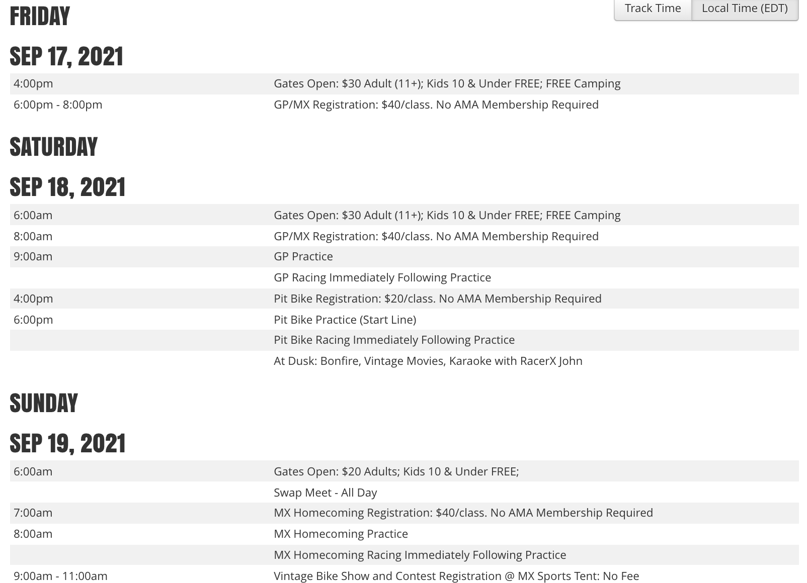 The GP-style Moto-X Country racing is a hybrid event combining elements of off-road racing and motocross into one unique competition. Taking place over a roughly three-mile course, racers will encounter woods sections intermittently separated by big European-style grass track areas. There are classes for all ages and skill levels, and you don’t even have to be a “Vet” rider to participate! All classes will race (2) 30-minute motos on this hybrid course.