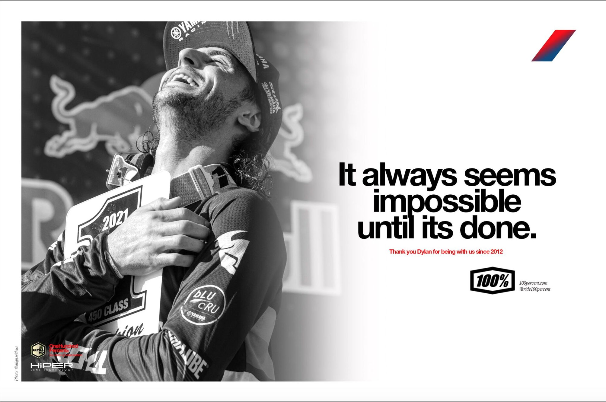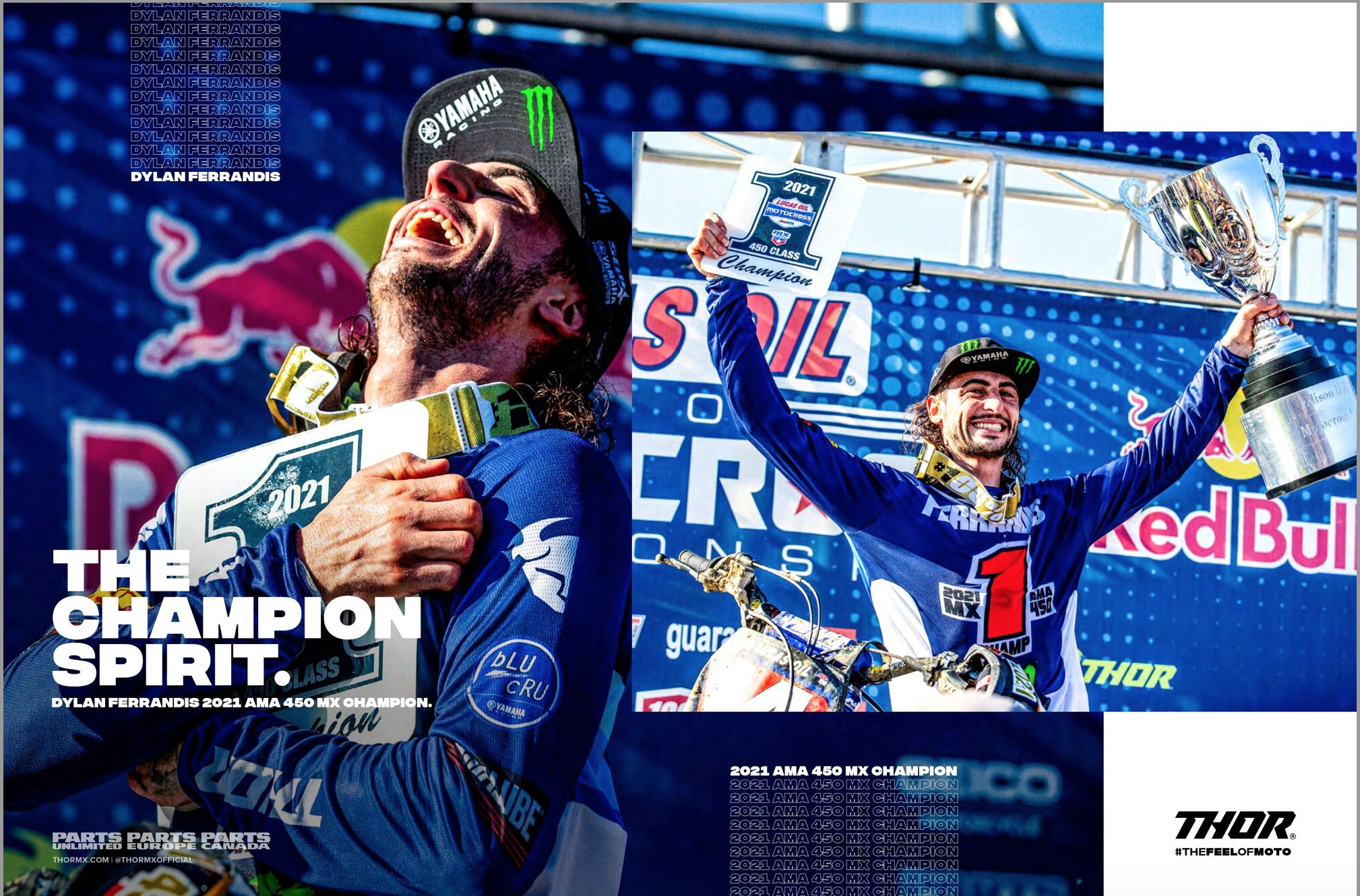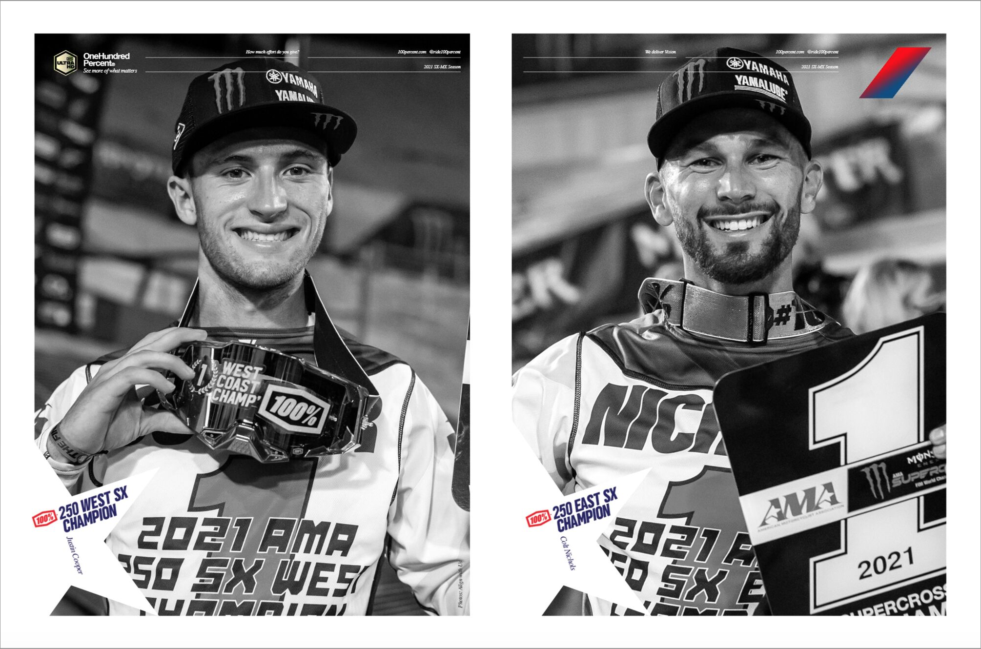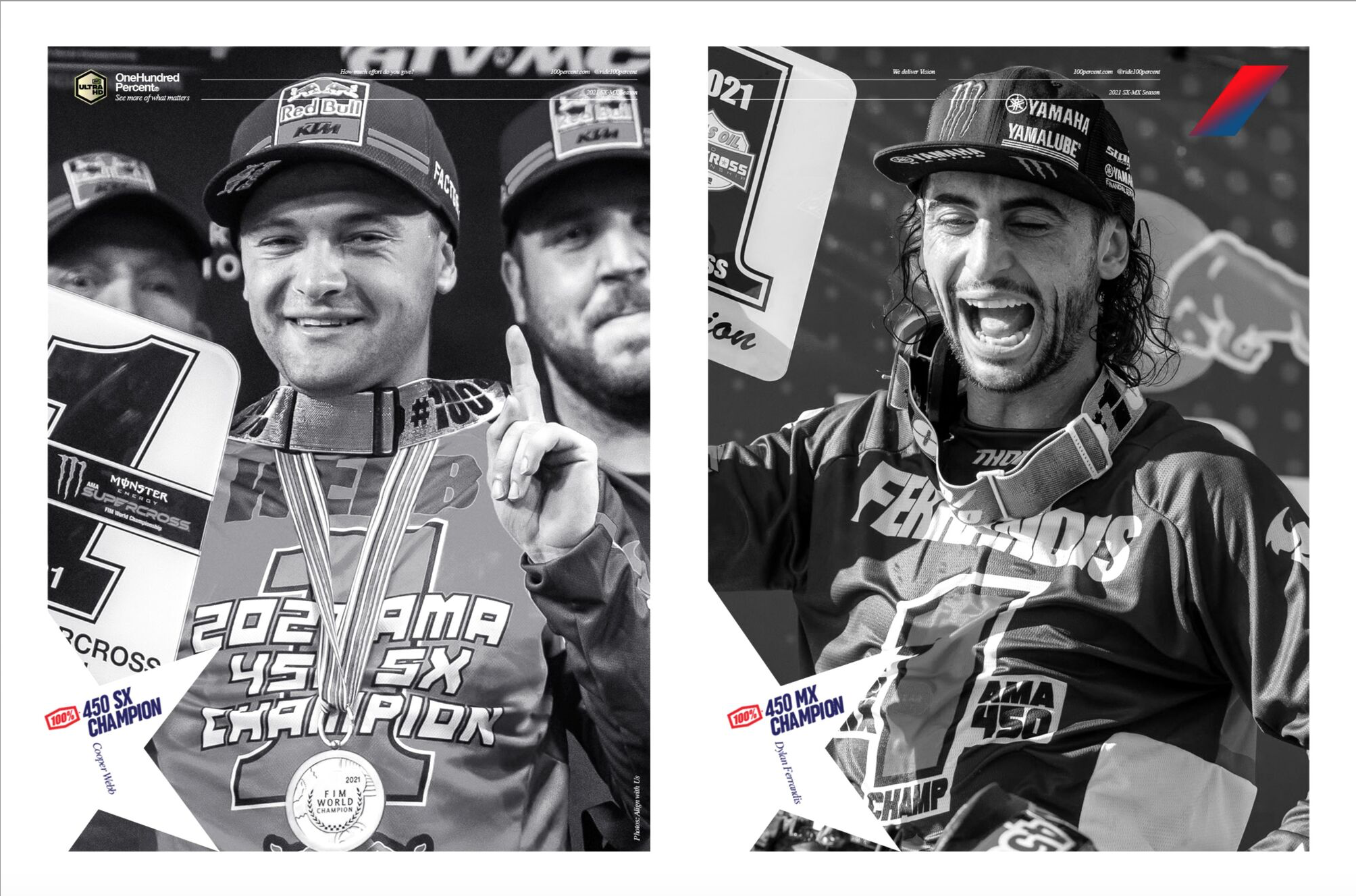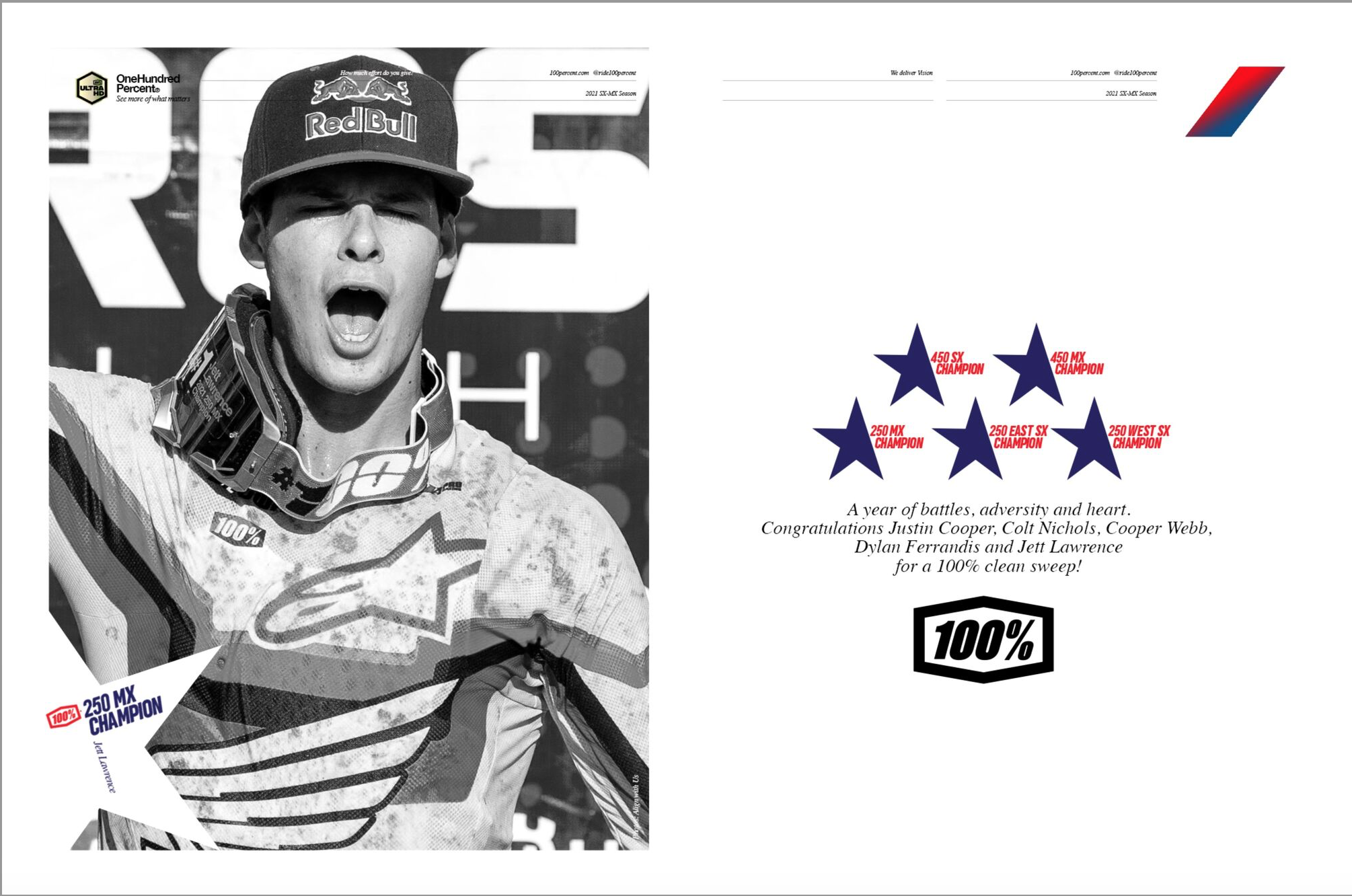 And you've gotta love the simplicity of this series of spreads by 100% celebrating their clean sweep of all of the AMA championships in 2021, with 250 SX East and West Champion Justin Cooper and Colt Nichols on the first spread, then 450 SX and 450 MX Champions Cooper Webb and Ferrandis, and then finally Jett Lawrence on the last spread, which gave 100% that five-title sweep.