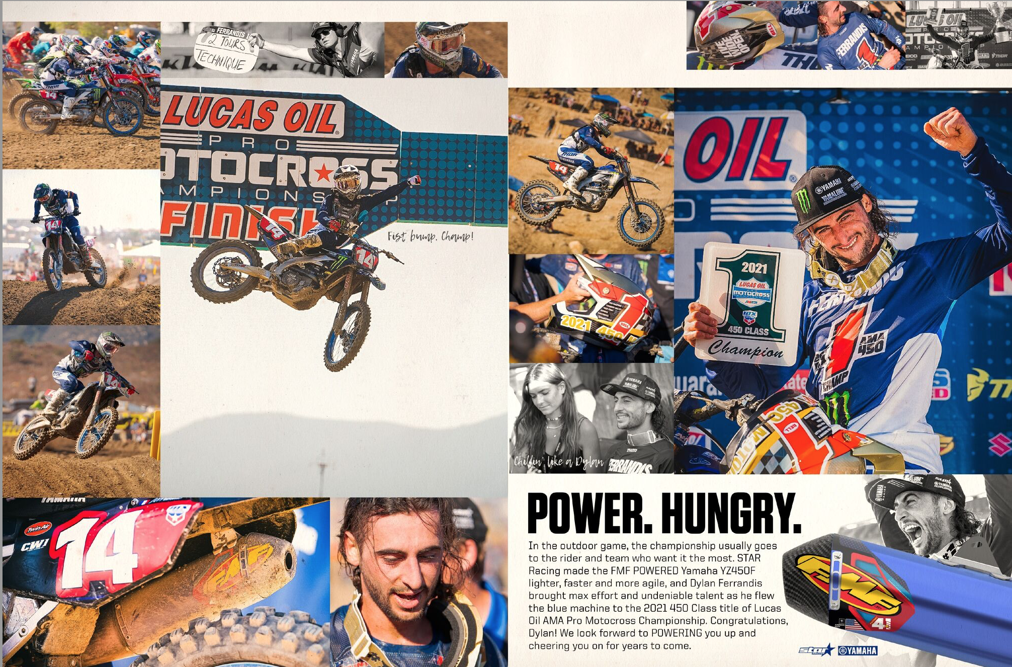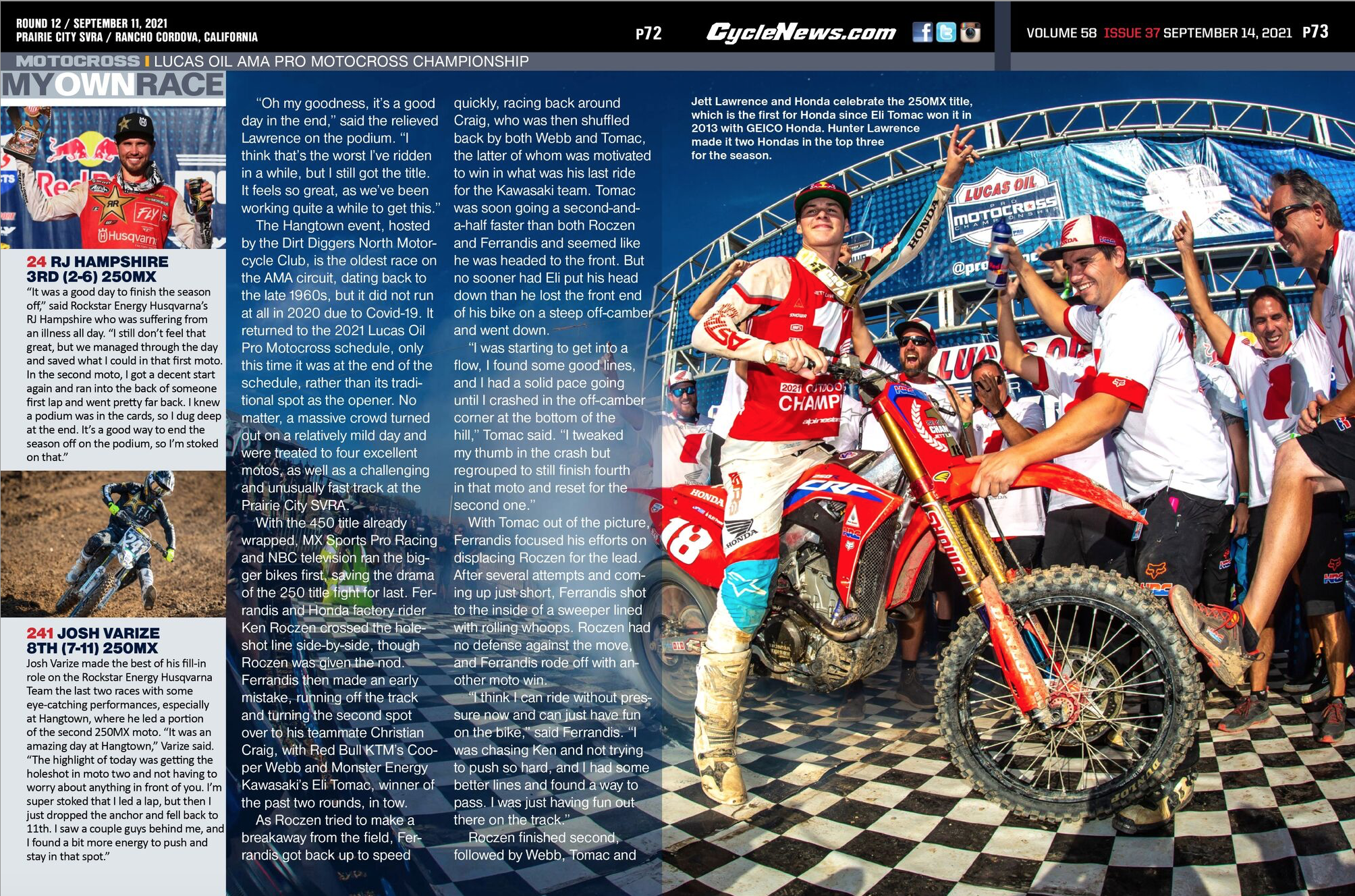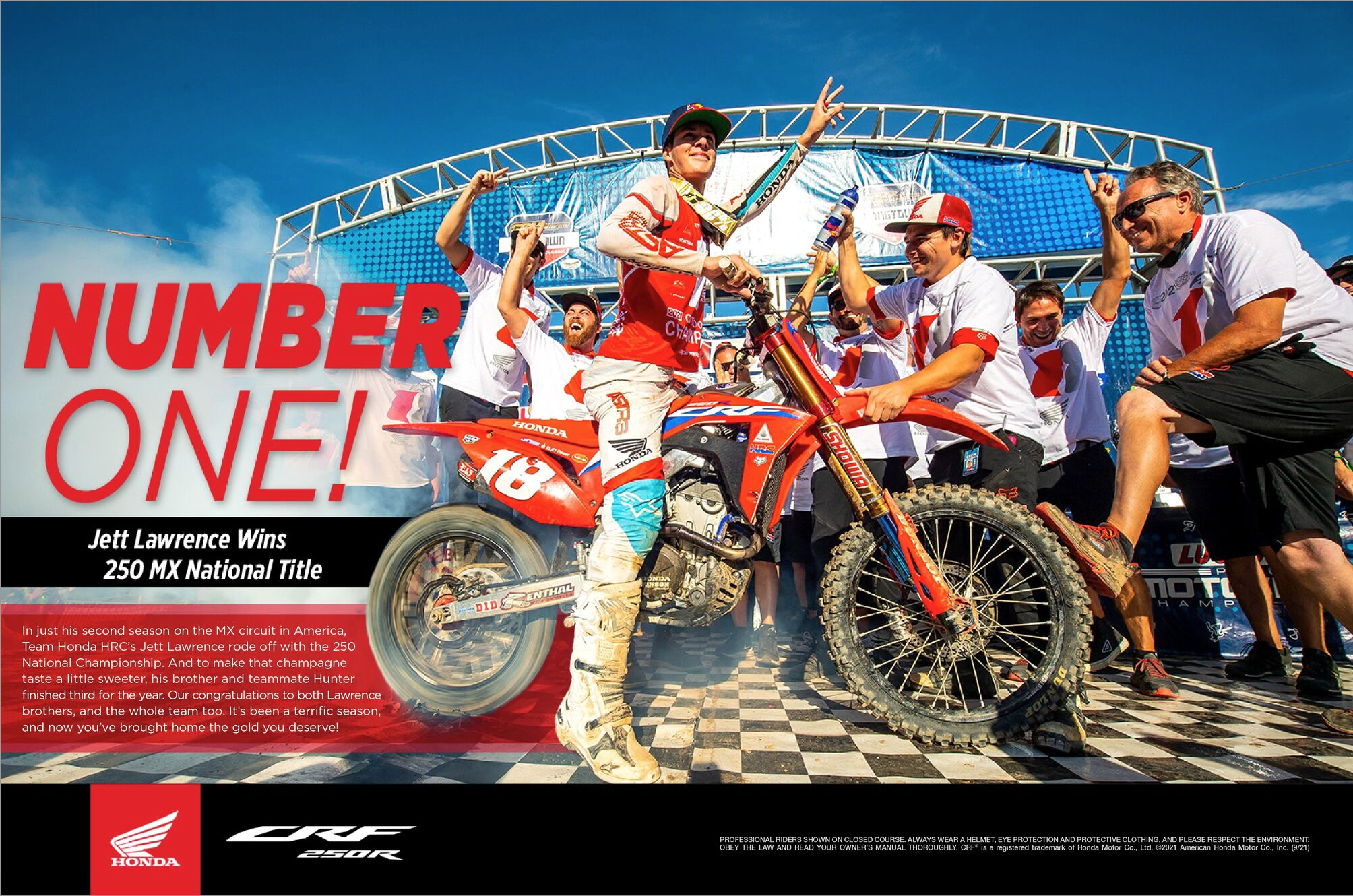 While the Ferrandis' championship ads had a mostly #1 plate vibe, with Jett Lawrence one week later his podium burnouts were the hot championship ad theme in Cycle News...