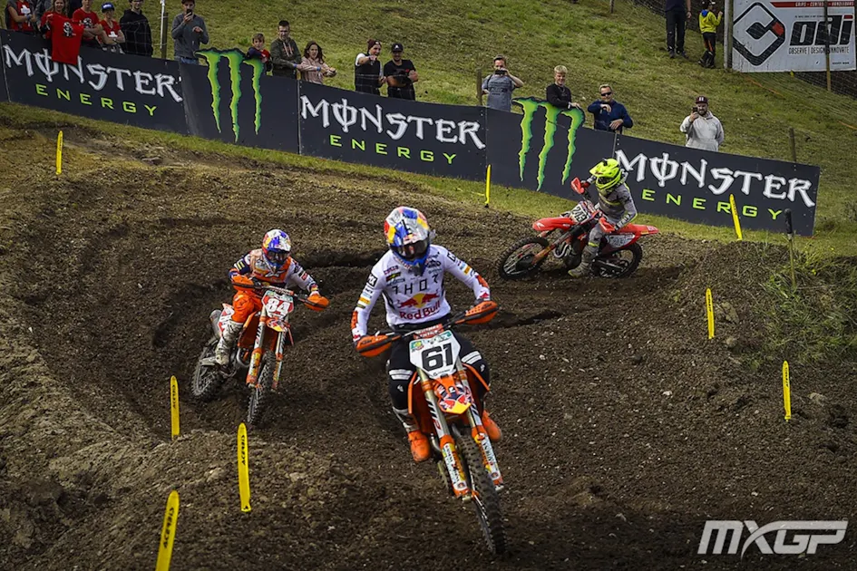 While Herlings was able to fully profit from Gajser’s weakened state in Sardinia to go 1-1, and kept his momentum going with another 1-1 for Team Netherlands at the Nations, it was his turn to again be hit by the swinging pendulum of fortune at Teutschenthal. Actually, the force arrived courtesy of his Red Bull KTM teammate Jorge Prado. A thrilling chase between the pair was decided by just a tenth of a second at the finish line in the first moto with Prado narrowly hanging on for his third checkered flag of the season after holeshotting. Inexplicably the youngster veered across the take-off to the long finish-line jump and collected Herlings mid-air. The duo tumbled in a mix of limbs and machinery. Herlings was already landed on by Ivo Monticelli this season, which fractured his left shoulder blade This time he immediately walked away from the melee, keen not to be landed on a third time. The Dutchman was clearly shaken by the incident and complained of a sore knee in the second moto that explained his conservative run to third place. Prado, identified by many as the villain of the piece but who still hasn’t given his version of events, was stretchered away and taken to the hospital in the nearby city of Halle to receive stitches for a cut on his chest.
