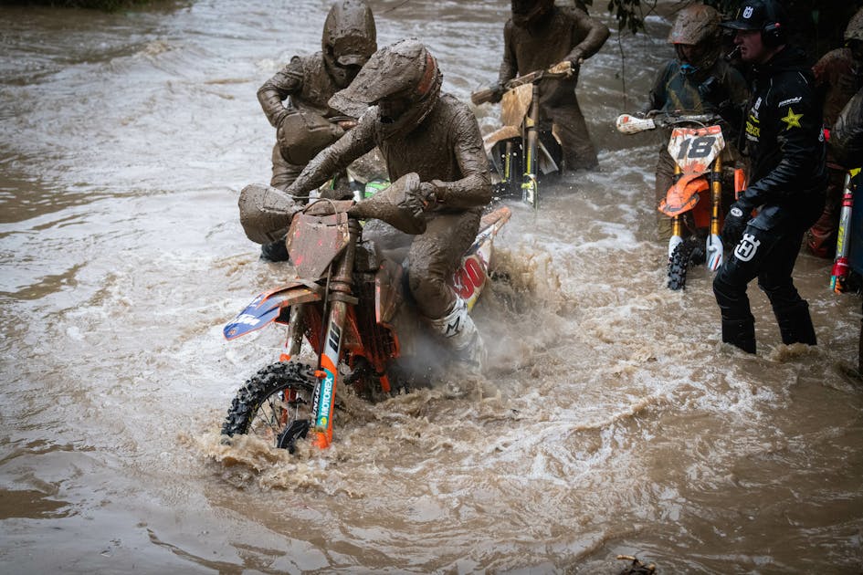 Massive rain all morning left the Ironman track nearly impassable. The three-hour race was cut down to two, and major sections of the track were removed. Small streams had turned to rivers, and bikes were drowning out everywhere. At one point, Kelley’s title hung in the balance, as his KTM ground to a halt.