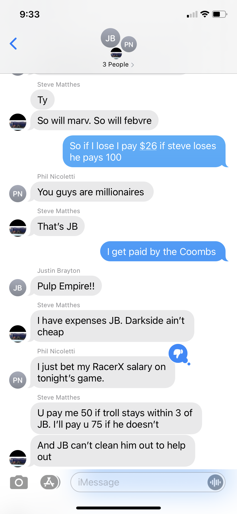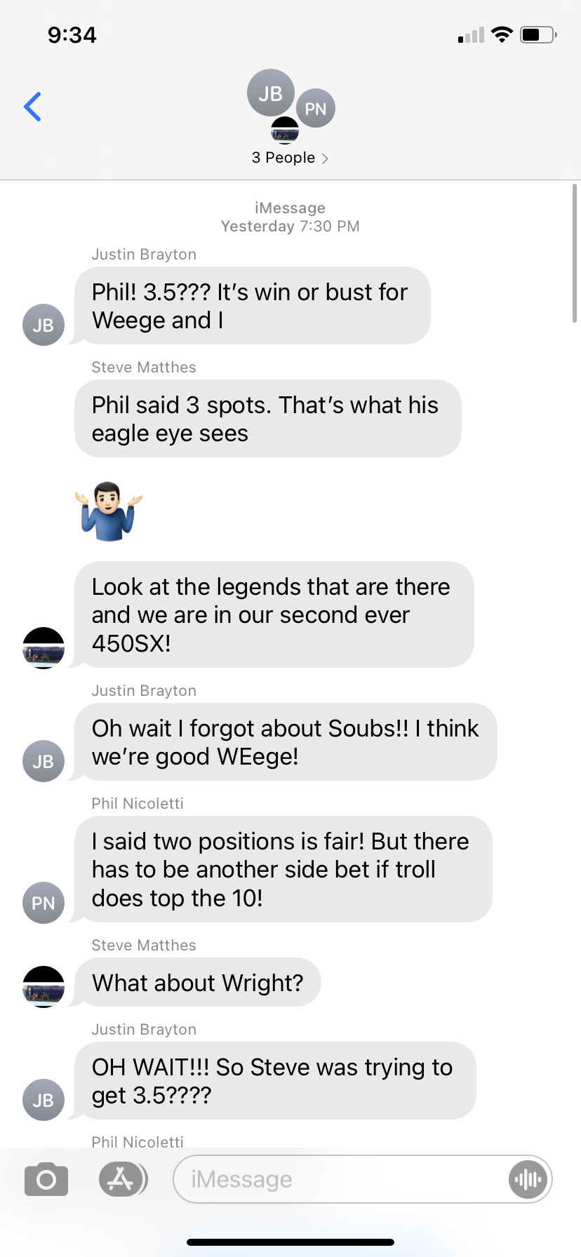 Oh Jason, you and Steve gotta quit it. The Brayton vs Troll hype is way too high! Another bet that would be good for Paris would be to see who gets louder cheers in a French Stadium. Musquin or Febvre?! Of course you two are obsessed with your guys. Now, to say Alex is ready to take down Brayton right now is just a bit far fetched! But for shits and giggles, I believe two positions is plenty fair for Paris. But I think there should be some sort of odds if Troll BEATS Brayton. Yeah that’s right, anything can happen. Maybe give 2:1 odds for that?! I think should be a double sided bet. I think the line should be set at three positions. If Brayton wins, Troll would have to get forth in order got you to get the money not third. So I say you guys make it a $100 bet! If Alex isn’t within two positions, PulpMx Inc pays you. If Troll BEATS Brayton, then Jason pays $200. That’s fair odds to me. What do you guys think?