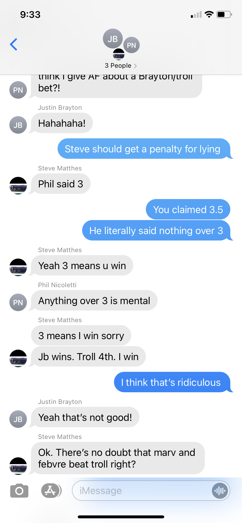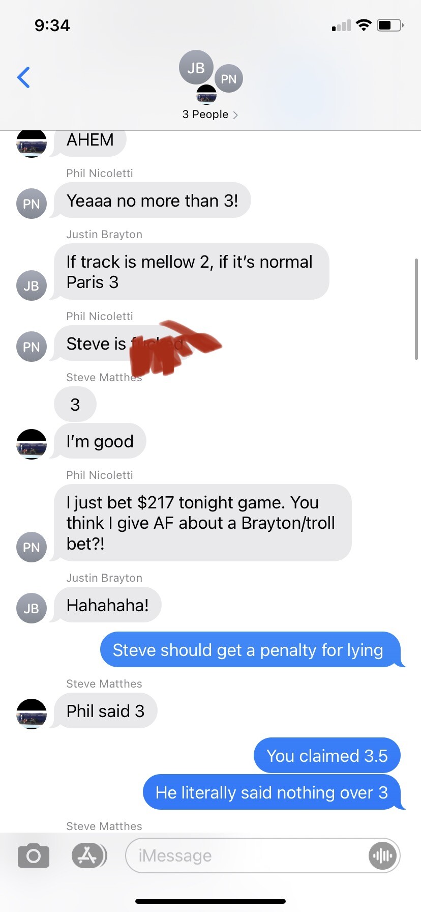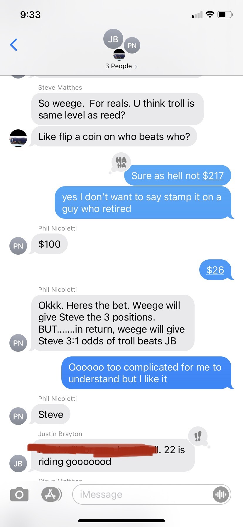 Note: Late last night, Steve Matthes tried to cheat and claim Phil set the line at 3.5 positions, at which time Justin Brayton entered the conversation. Enjoy this text thread between Matthes, Weigandt, Brayton, and Phil.