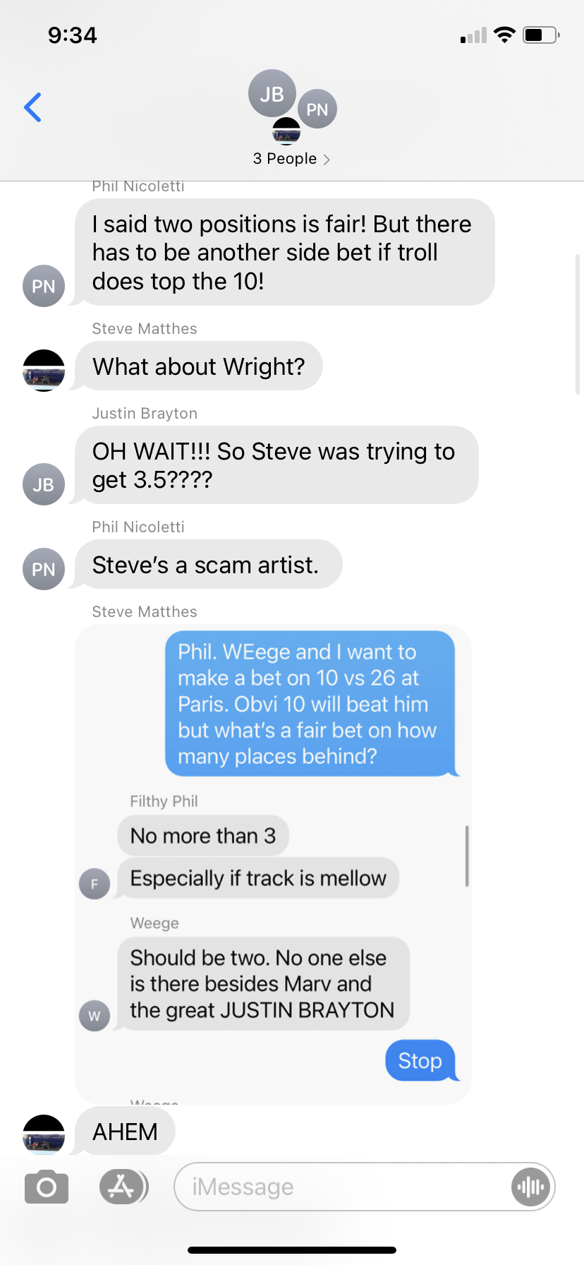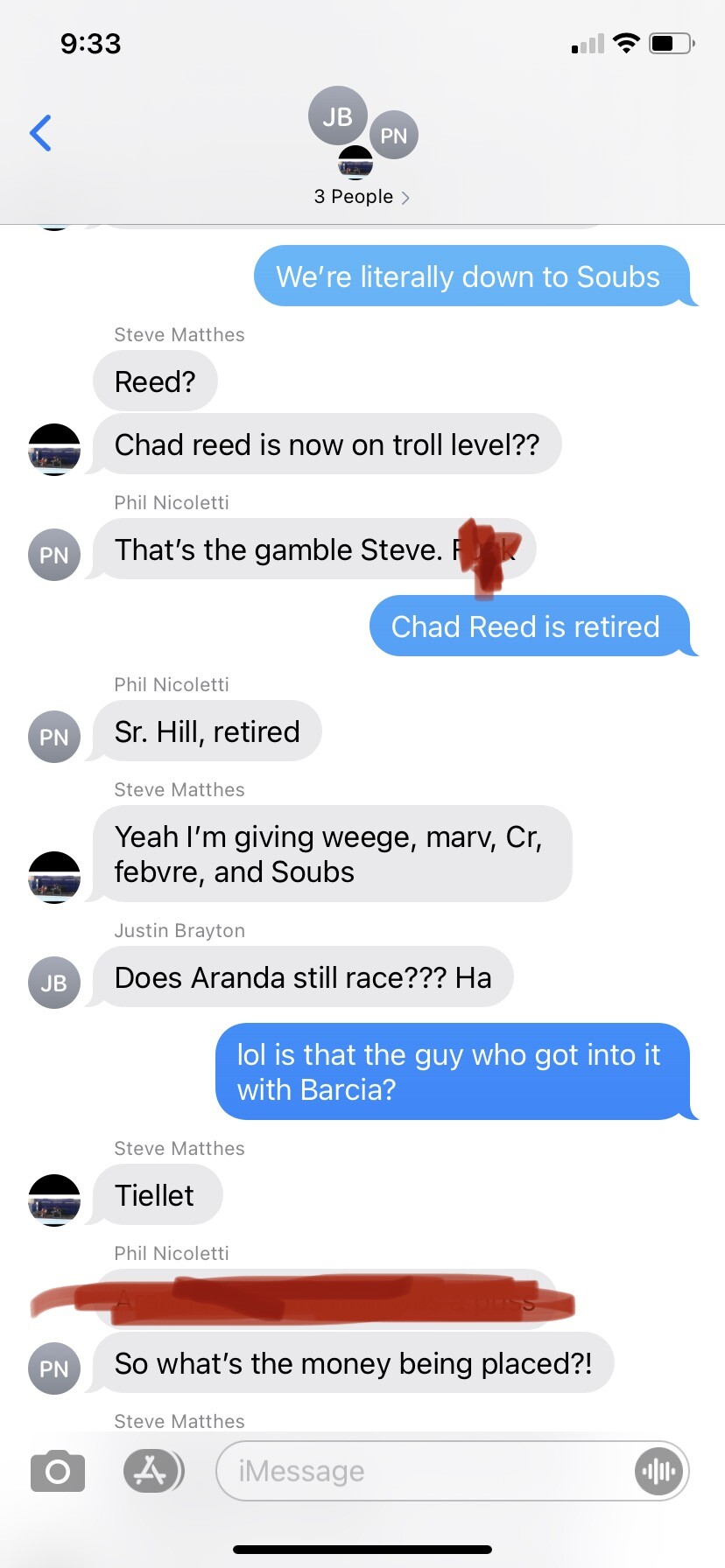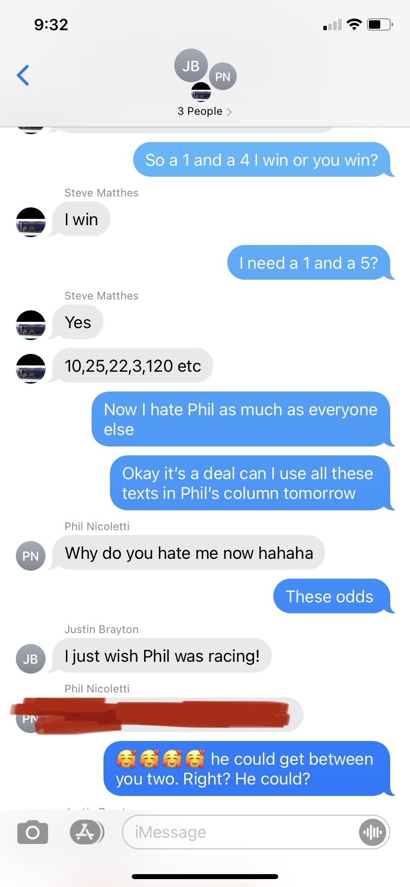 Note: Late last night, Steve Matthes tried to cheat and claim Phil set the line at 3.5 positions, at which time Justin Brayton entered the conversation. Enjoy this text thread between Matthes, Weigandt, Brayton, and Phil.