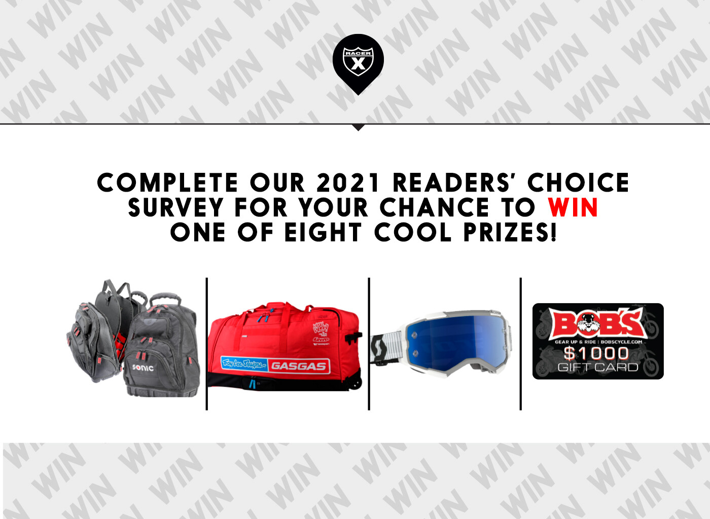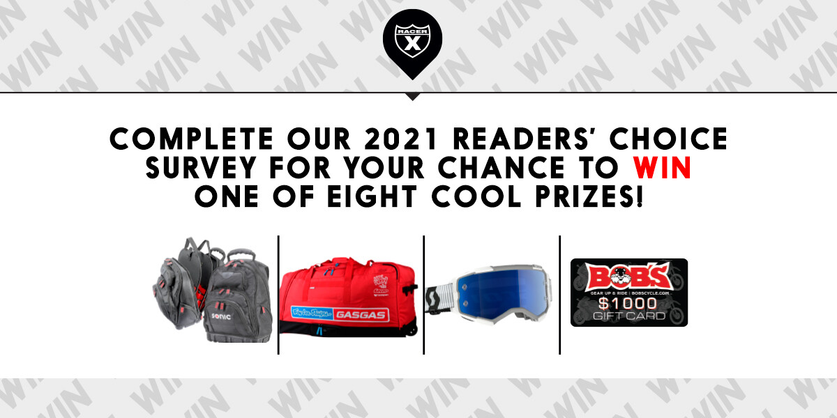 Our annual Racer X Readers' Choice Survey is ready for you to fill out, and we’re offering killer prizes for participants. There are a total of eight chances to win! Upon completion, you'll be entered in a drawing to win a $1000 gift card from Bob's Cycle Supply, a Troy Lee Designs wheeled gear bag, a Sonic Tools backpack (3 available), and Scott-Sports Fury goggles (3 available). That's over $2,100 in total prizes! Winners will be announced January 3rd.