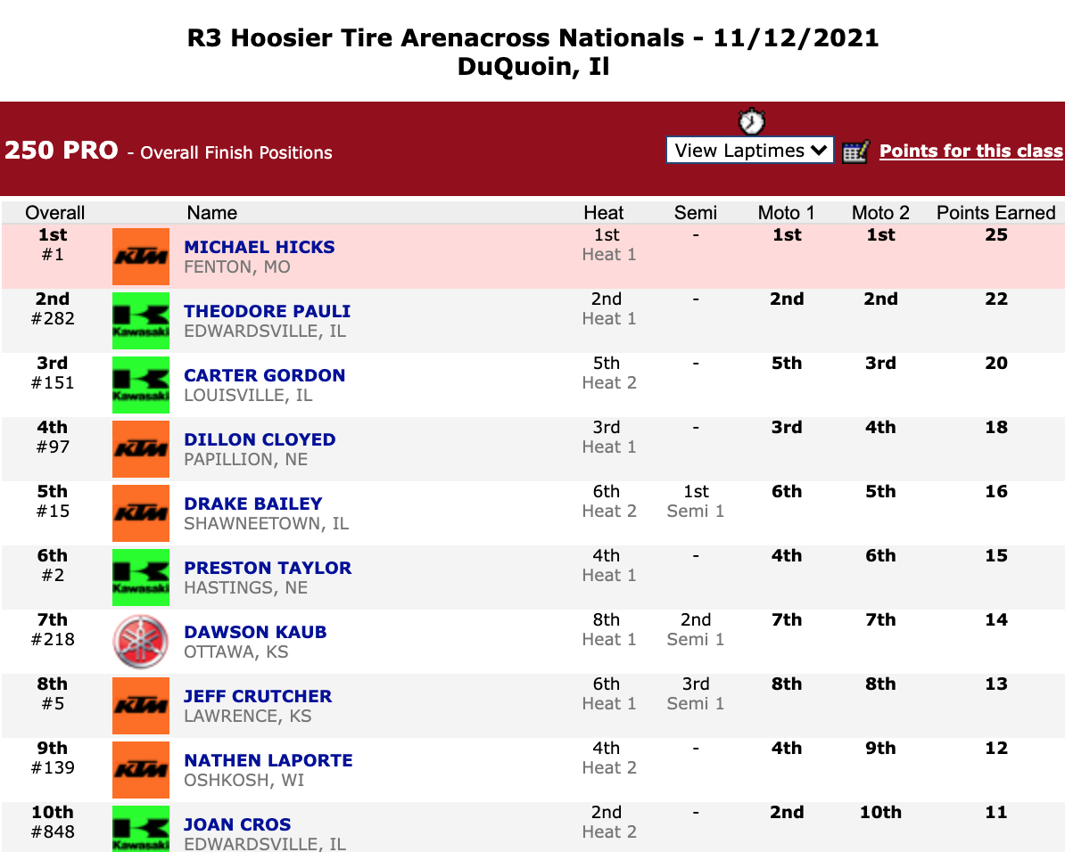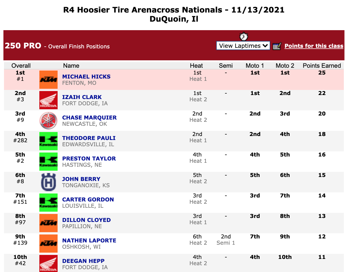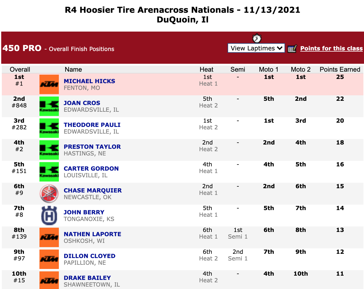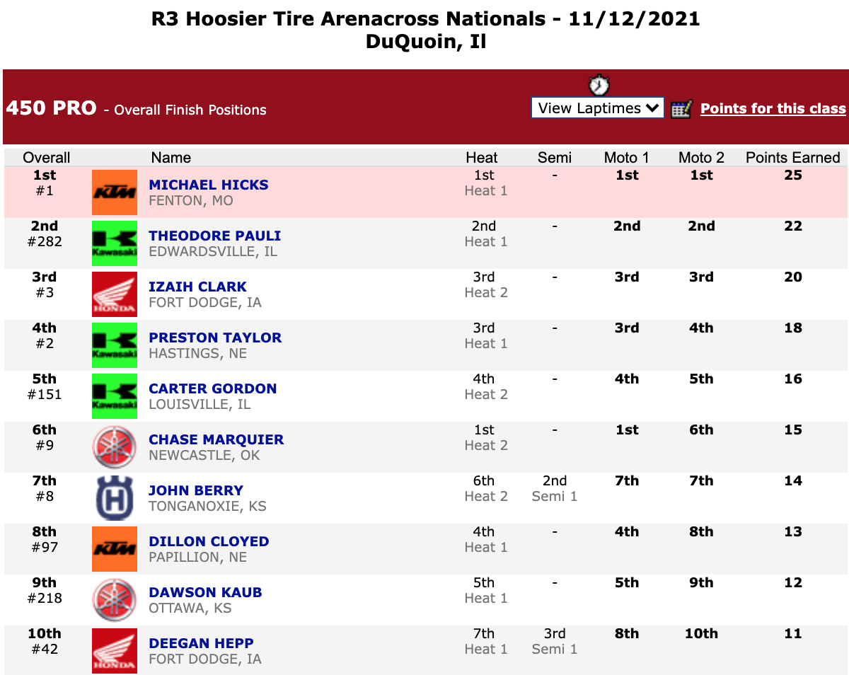 | Michael Hicks | Hoosier Arenacross Series | 450 Pro |